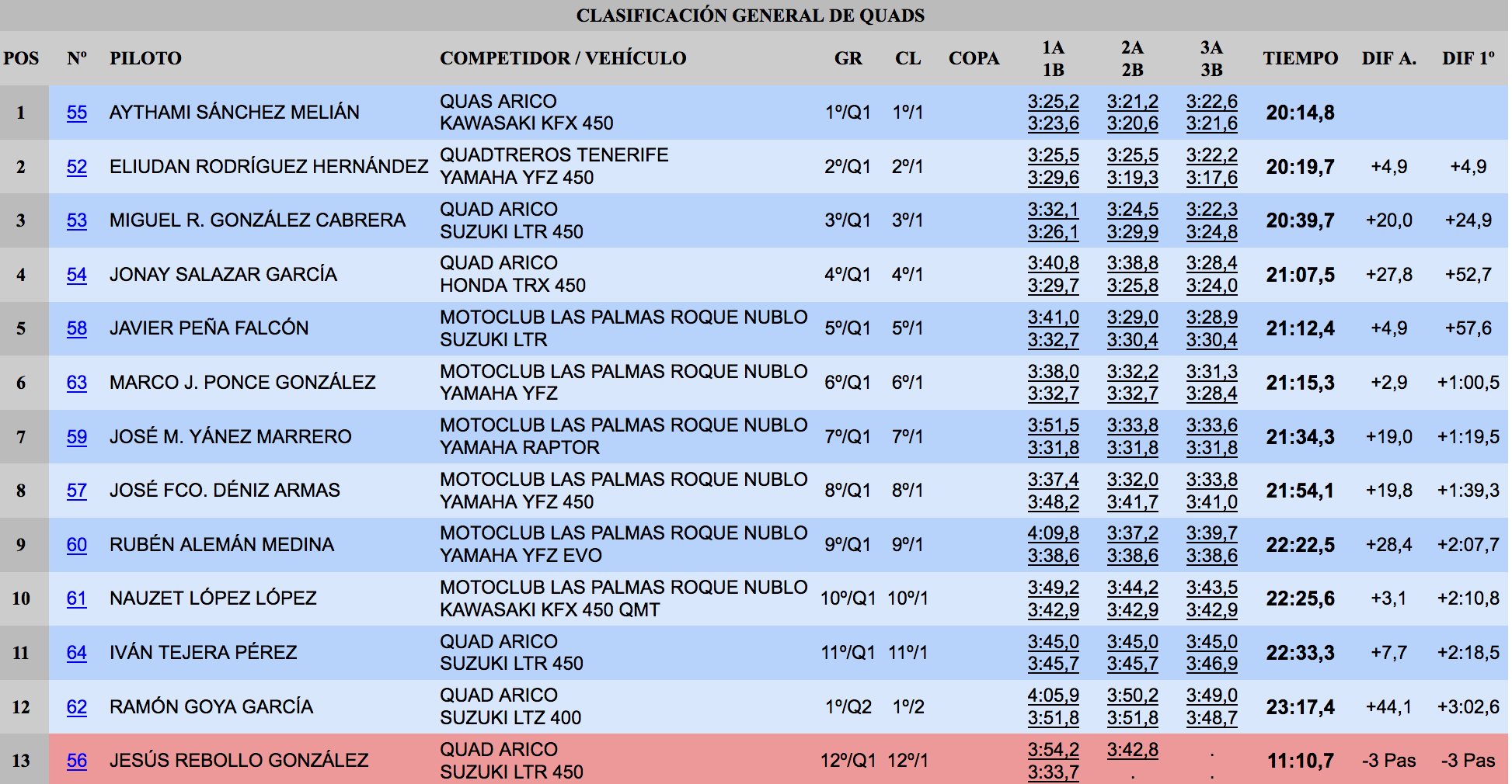 Entre los numerosos pilotos de los quads, el triunfo estuvo muy disputado hasta la última manga, con victoria final del tinerfeño Aythami Sánchez (Kawasaki), sobre su paisano Eliudan Rodríguez (Yamaha), por menos de cinco segundos de diferencia, subiendo al tercer escalón del podio otro tinerfeño, Miguel González (Suzuki). Jonay Salazar fue cuarto y se llevaba el Trofeo de categoría Q1, mientras en Q2 ganaba en solitario Ramón Goya. Mencionar que el primer piloto grancanario fue Javier Peña, quinto de la general.