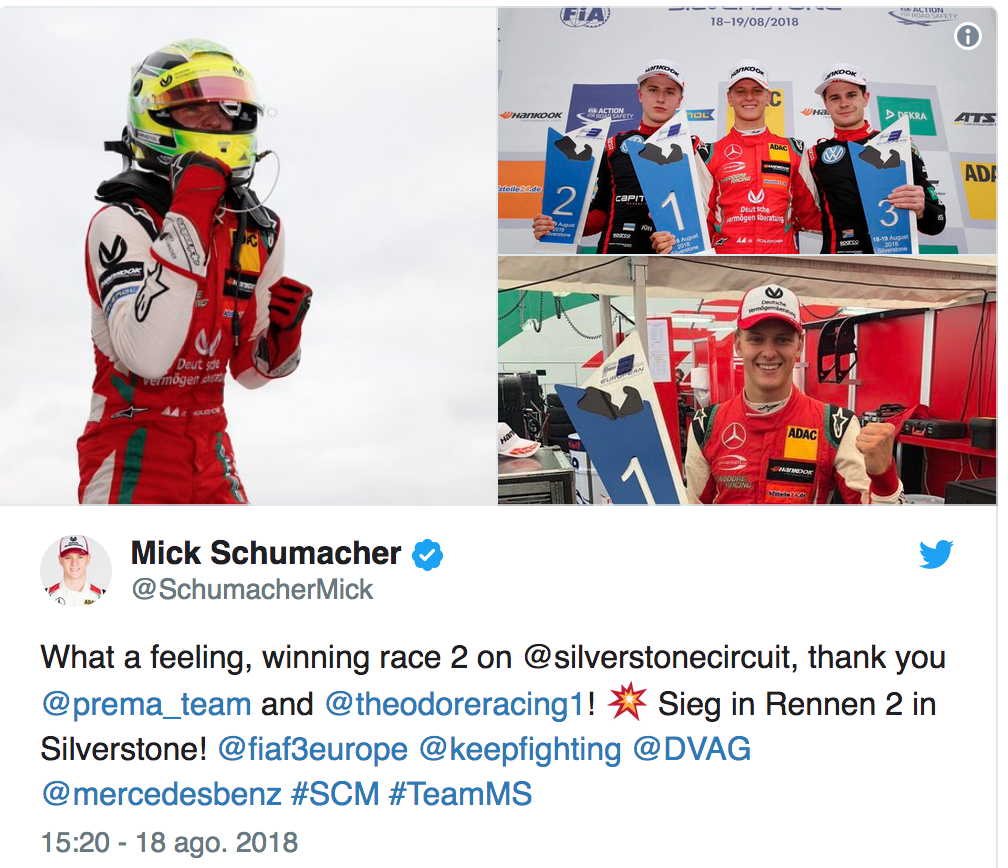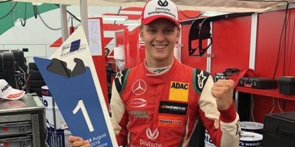 El alemán Mick Schumacher, hijo del séptuple campeón mundial de Fórmula Uno Michael Schumacher -asimismo plusmarquista histórico de victorias en la categoría reina (con un total de 91)- ganó este sábado la segunda carrera del campeonato de Europa de Fórmula 3 disputada en el circuito inglés de Silverstone.