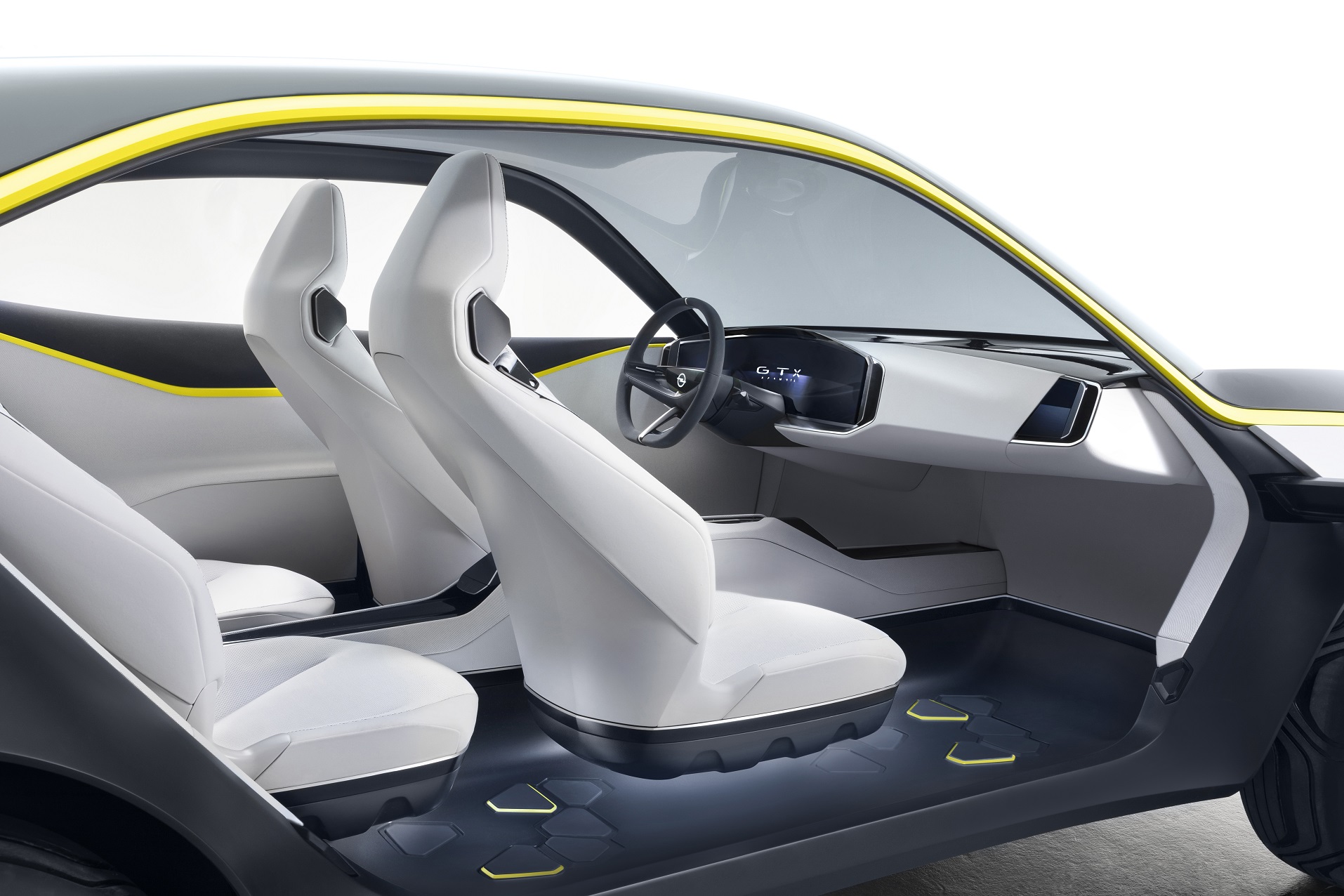 Para contrarrestar esta simplificación visual, varios detalles gráficos originales intensifican la apariencia del GT X Experimental. Hay una serie de triángulos recortados a lo largo de la talonera situada debajo de la puerta trasera del conductor: uno de ellos lleva una pantalla LED hexagonal que muestra el nivel de carga de la batería. Las llantas de 17 pulgadas parecen mucho mayores gracias a las robustas cubiertas de caucho que se extienden por ellas para aumentar visualmente el tamaño de los neumáticos azul oscuro. Las líneas amarillas del borde reproducen el acento distintivo amarillo de la carrocería y rodean el «Blitz» del emblema electrónico que permanece estático mientras giran las ruedas. Y para subrayar el carácter SUV del coche, un revestimiento protector se extiende alrededor de la parte inferior de la carrocería y añade a la apariencia robusta y sólida del GT X Experimental una presencia enérgica.