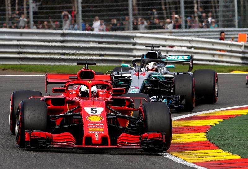 El piloto alemán Sebastian Vettel impuso en el Gran Premio de Bélgica disputado en el circuito de Spa-Francorchamps la ley que indica que el Ferrari es el coche más veloz en este trazado al adelantar al británico Lewis Hamilton (Mercedes) en un caótico inicio con un choque y varios abandonos.