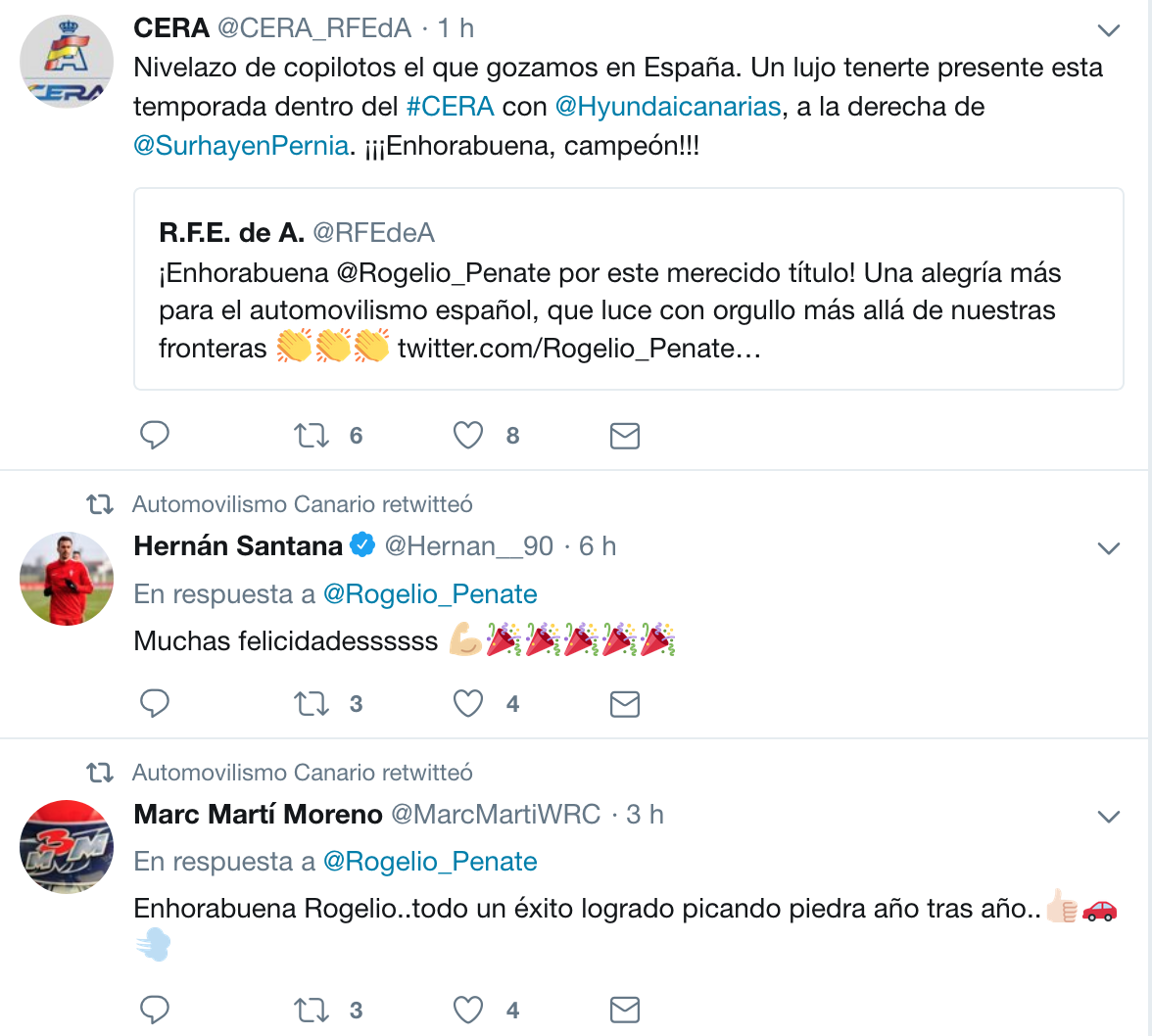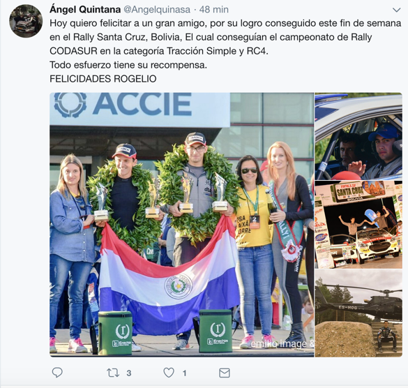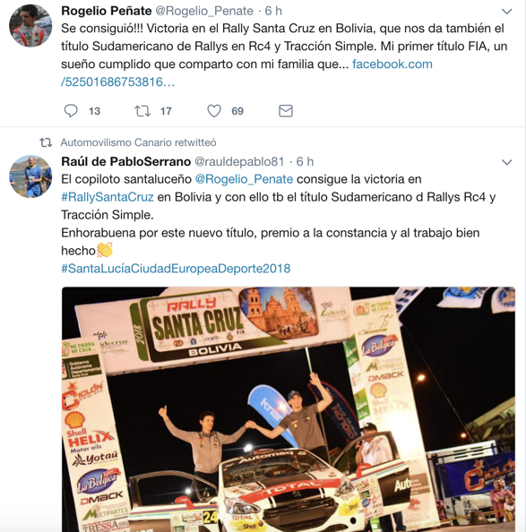 El experimentado copiloto grancanario Rogelio Peñate logró este pasado fin de semana, junto a a Diego Dominguez (Peugeot 208 R2), la victoria en el Rally Santa Cruz en Bolivia, lo que les dio el título Sudamericano de Rallys en Rc4 y Tracción Simple.