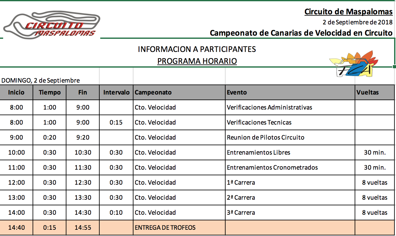 En total son tres carreras de ocho vueltas de duración y se van a disputar en esta ocasión utilizando la pista pequeña de 2.270 metros del circuito. El horario programado es a las 12, 13 y 14 horas, concluyendo todo sobre las 14:40 horas de la tarde, con la entrega de trofeos.