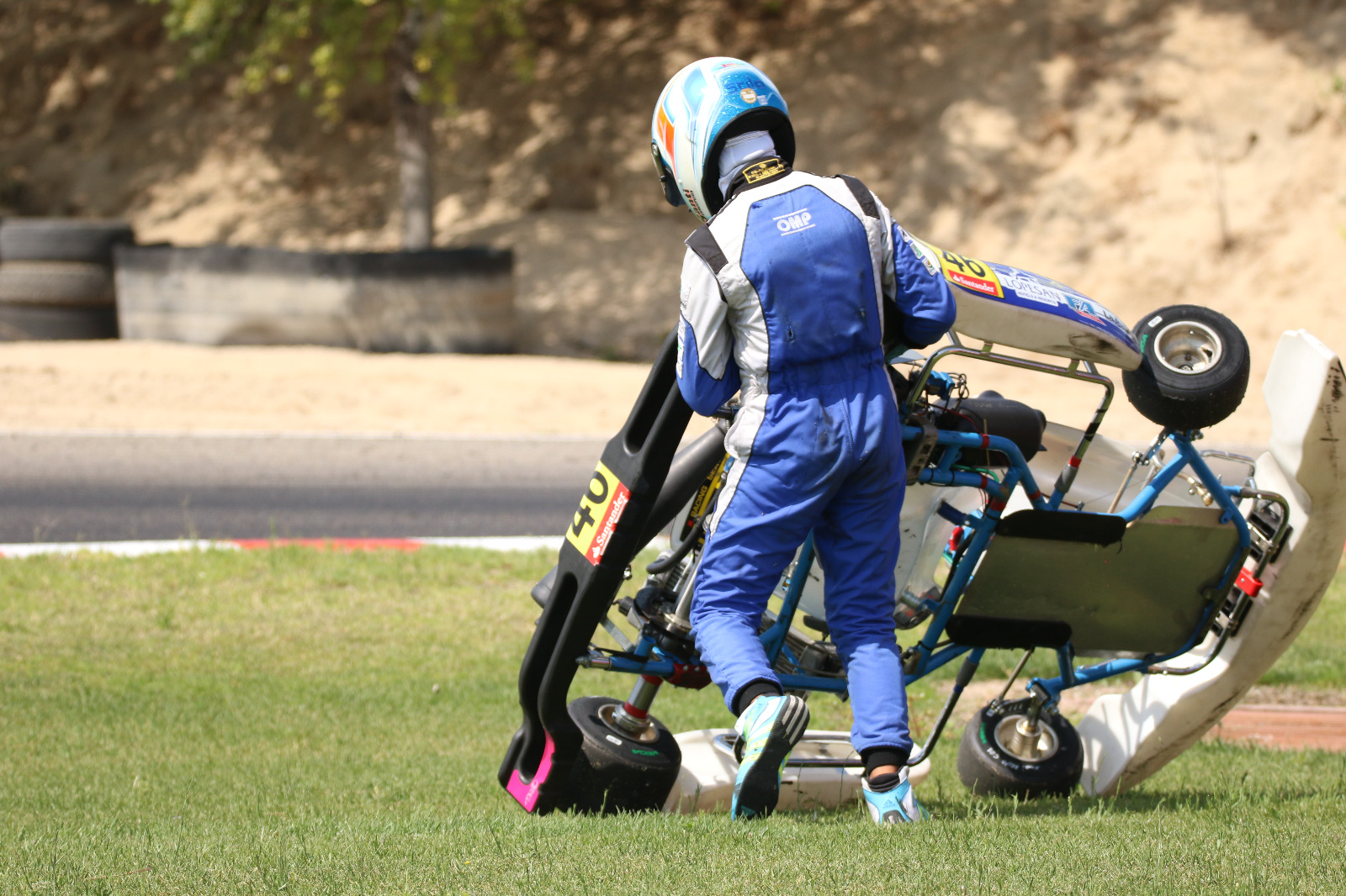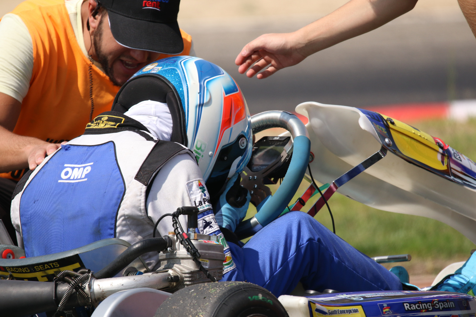Pero en las mangas clasificatorias la suerte no estuvo de su lado. En la primera de ellas se salió la cadena del kart y no pudo completar una sesión que era clave para obtener una buena posición de cara al domingo. En la segunda, otro fallo le llevo a ser protagonista de una acción de tintes heroicos. Un problema eléctrico en la botonera de encendido hizo que realizase 9 de 11 vueltas con una sola mano en el volante; la otra sujetaba el cajetín y, como recuerda el piloto, “tenía que hacerla para poder clasificarme”. Acabó en el puesto 32, lo que le daba acceso a las dos carreras de la última jornada. Un sábado, en cualquier caso, en el que el motor tampoco fue redondo debido a las láminas del carburador, aspecto que fue solventado para el último día.