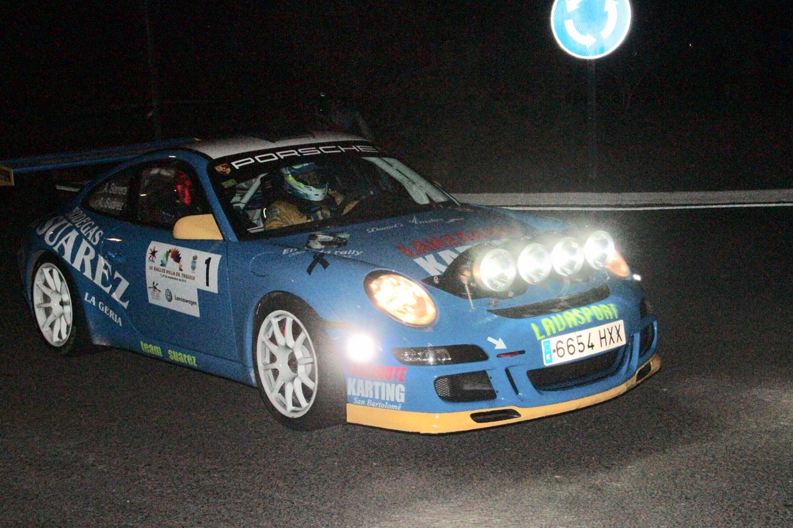 Después de los dos primeros tramos cronometrados disputados durante la noche del viernes, con dos pasadas consecutivas a los 10 kilómetros de Teseguite-Guatiza-El Mojón, los actuales dominadores del Campeonato de Lanzarote marchan como líderes del rallye tras esta primera jornada nocturna, llevando el Porsche 911 a lo alto de la clasificación provisional, donde de momento no tiene rivales de su nivel y atesoran una ventaja de 31 minutos sobre los siguientes clasificados. Además, Suárez rebajó su crono de los 5.13 a los 5.09 en la segunda pasada.