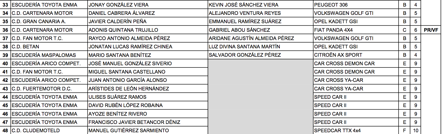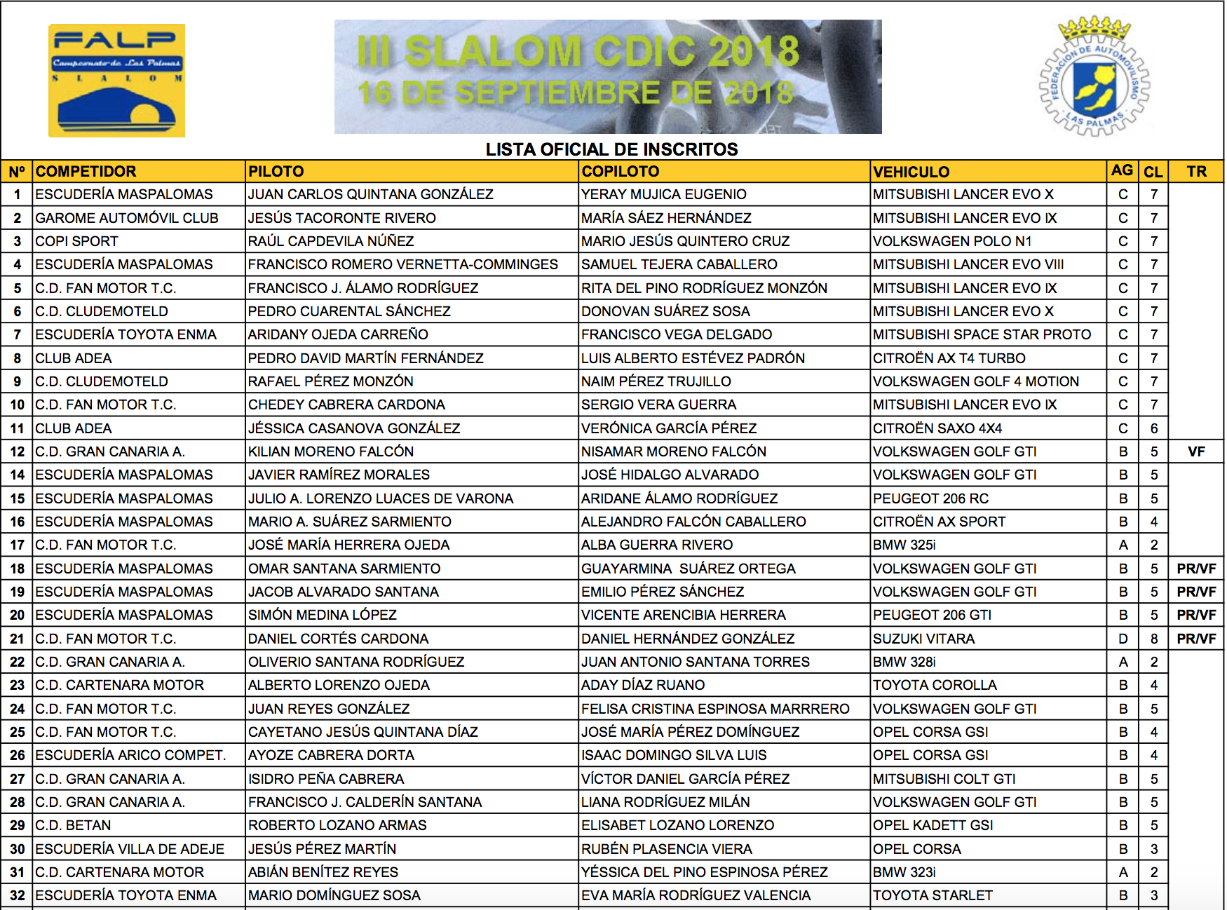 La prueba es puntuable para el Volante FALP que permitirá al ganador participar con todos los gastos pagos en la última cita del campeonato con un coche tipo R2 o similar. Aquí encontramos a pilotos como Omar Santana ((Golf), Jacob Alvarado (Golf), Simón Medina (Peugeot 206), Daniel Cortés (Suzuki Vitara), Adonis Quintana (Fiat Panda 4×4), que además son los mismos candidatos al Campeonato de Promoción de Slaloms, certamen donde se suma también Kilian Moreno (Golf GTi).