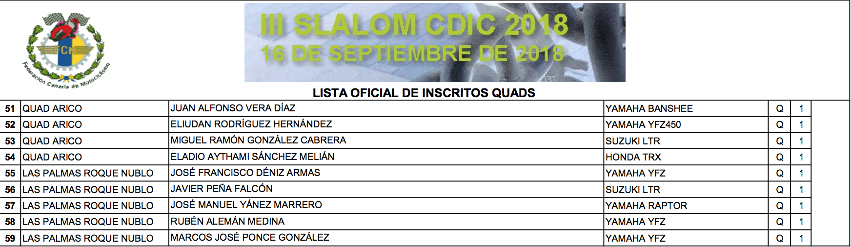 La Federación de Automovilismo de Las Palmas organiza para ese domingo 16 de septiembre el cuarto Slalom en Tierra del Campeonato Insular de Gran Canaria, que visita por tercera vez esta temporada el Circuito Islas Canarias, en Telde. Una cita que ha tenido una amplia respuesta de participación, con 56 equipos en turismos, nueve pilotos de car-cross y otros nueve con quads. En total son 56 vehículos para esta prueba, que se disputara a partir de las 10 horas, con un total de seis pasadas, tres en cada sentido del trazado, las dos primeras como mangas de reconocimiento.