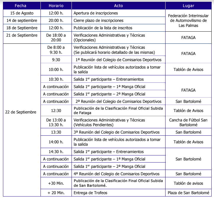 Los equipos que participen en las dos subidas o sólo Fataga podrán realizar las verificaciones opcionales la tarde del viernes en el pueblo de Fataga. Y los que solamente participen en San Bartolomé podrán verificar directamente en el pueblo de Tunte, el sábado a las 11:30 horas.