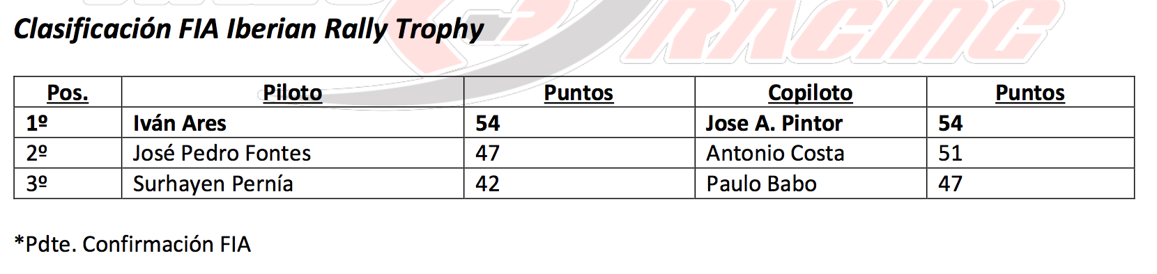 Tal y como ya lograran en la temporada 2017, cuando la dupla formada por Iván Ares y José A. Pintor se alzó con el Campeonato de España de Rallies de Asfalto y el FIA Iberian Rally Trophy, esta temporada, y gracias a sus resultados en el Rally Sierra Morena y en el Rally Princesa de Asturias, los actuales lideres del certamen nacional de rallies suman su primer título de la temporada al volver a imponerse en este trofeo de categoría FIA.