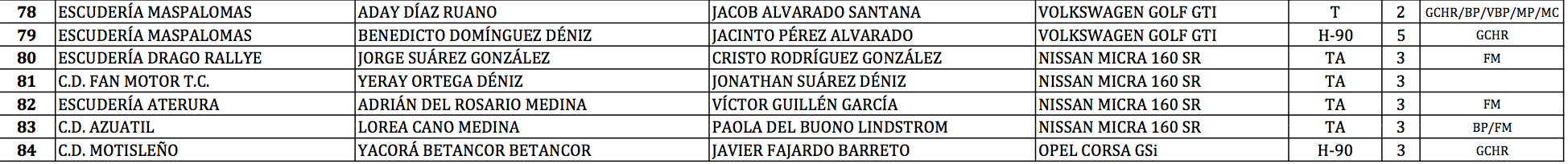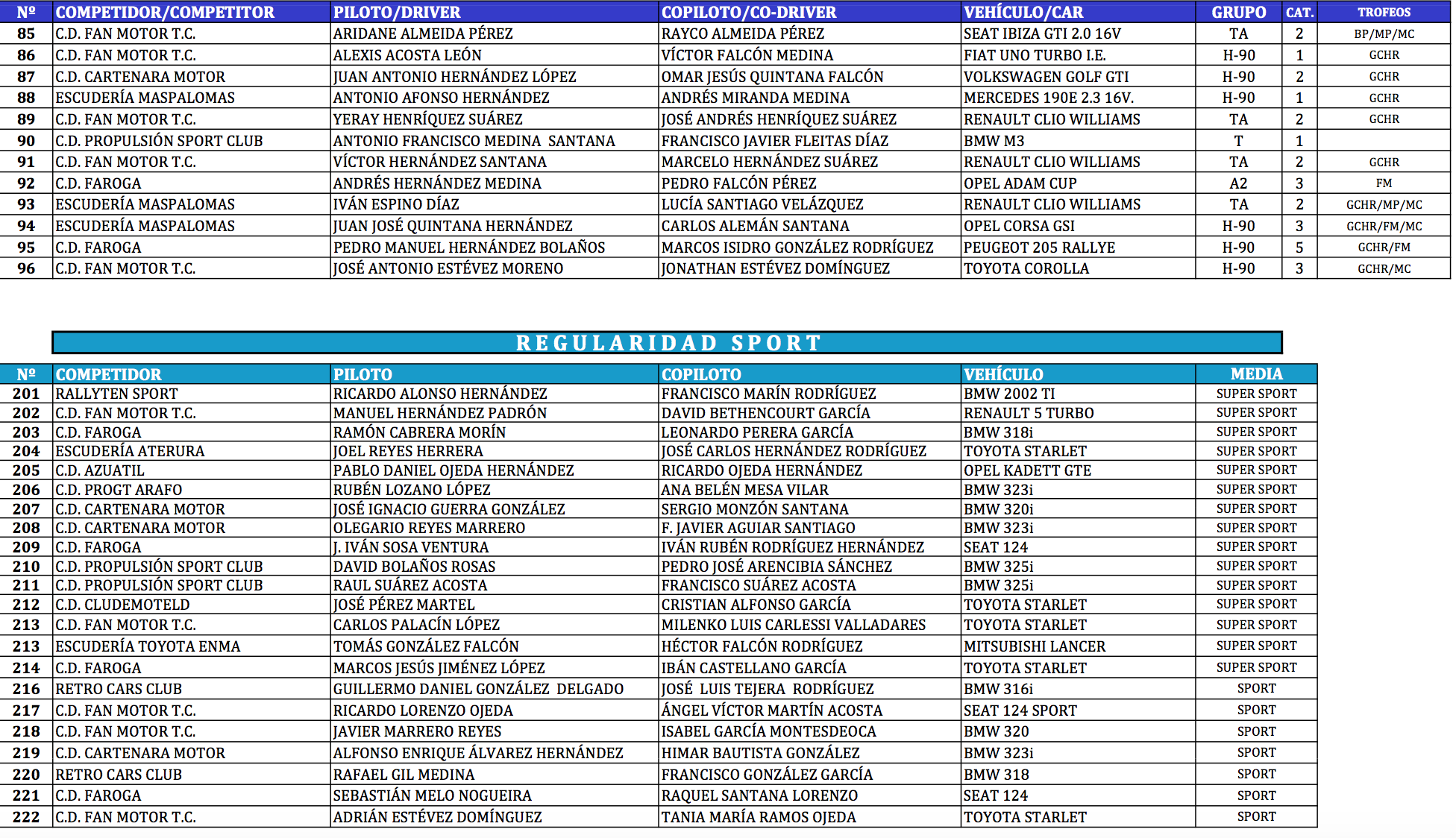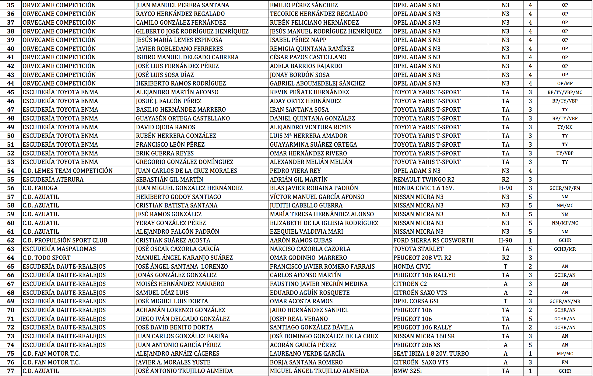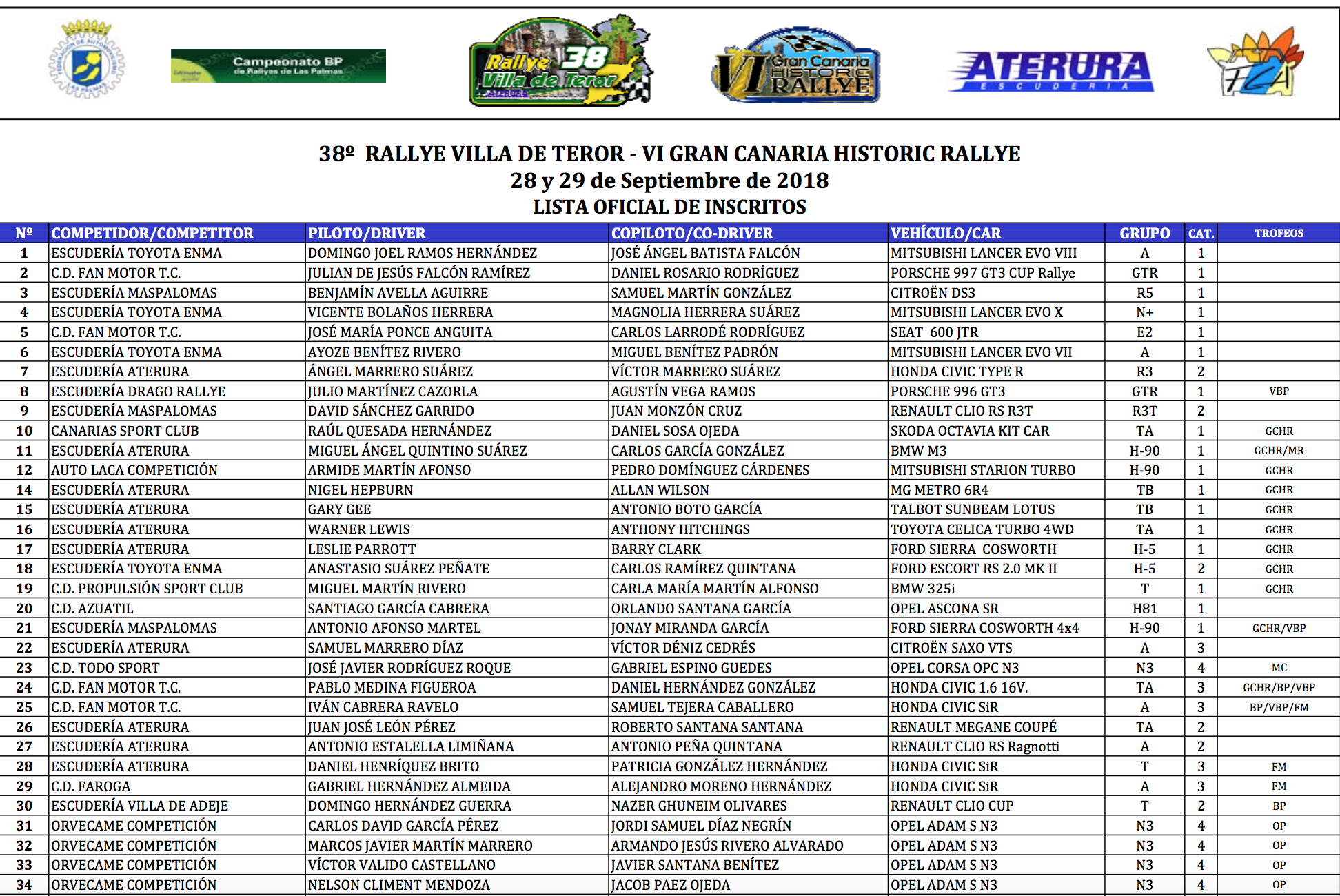 La nómina en términos generales la encabezan los defensores del título en el Campeonato BP de Rallyes de Las Palmas, Domingo Ramos-José Batista (Mitsubishi Lancer Evo VIII), destacando la presencia de los actuales líderes del provincial, Julián Falcón-Daniel Rosario (Porsche 997 GT3), el estreno de Benjamín Avella-Samuel Martín al volante de un flamante Citroën DS3 R5, o los varias veces vencedores del ‘Villa de Teror’, José María Ponce-Carlos Larrodé (SEAT JTR 600), entre otros.