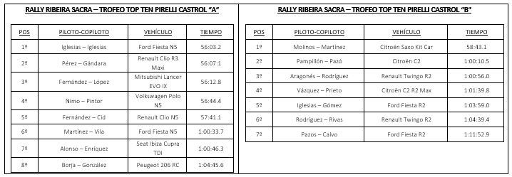 La séptima cita del Campeonato Gallego de Rallies dejó un gran sabor de boca en los “perseguidores” en la clasificación de cada apartado del Trofeo Top Ten Pirelli Castrol, pues en ambos apartados las distancias se han quedado al mínimo tras la cita disputada este fin de semana en los alrededores de la población ourensana de Luintra.
