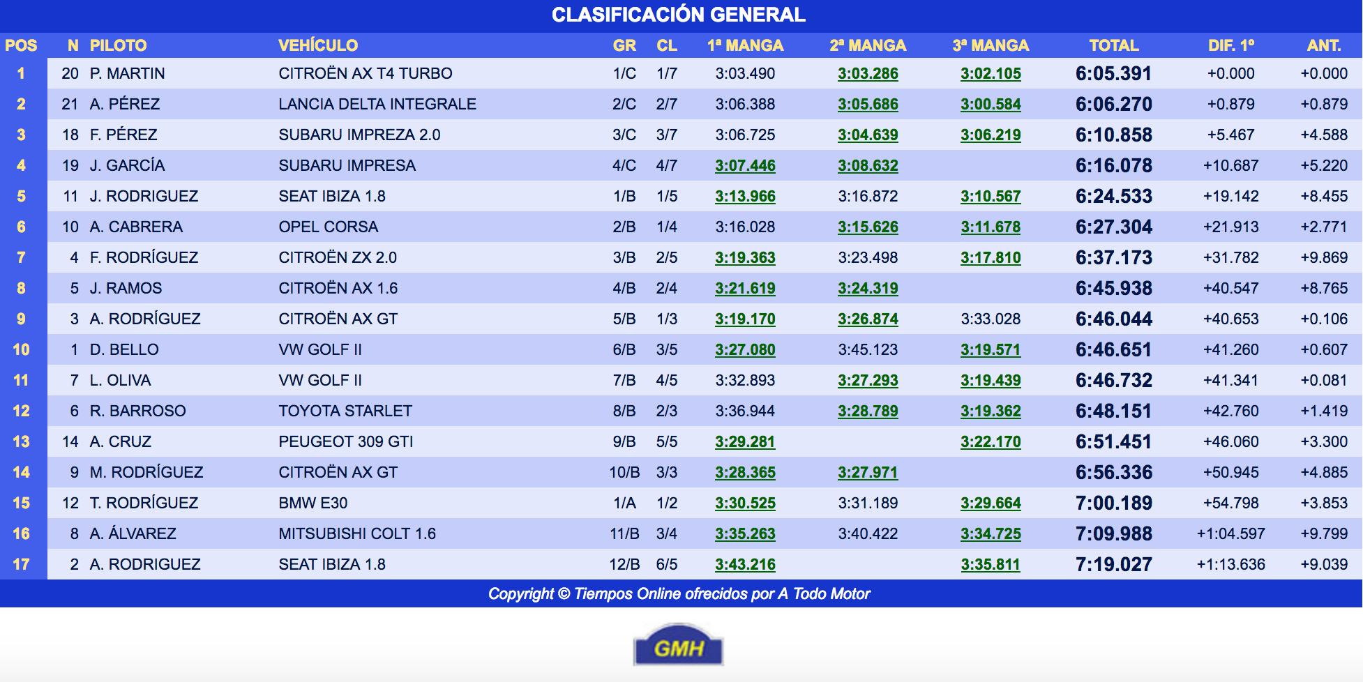 Martín y Estévez lograron invertir un tiempo de 6:05.391 en realizar las tres pasadas, lo que les valió para superar en 0.879 a Antonio Félix Pérez y José Emerio Guerra (Lancia Delta Integrale).
