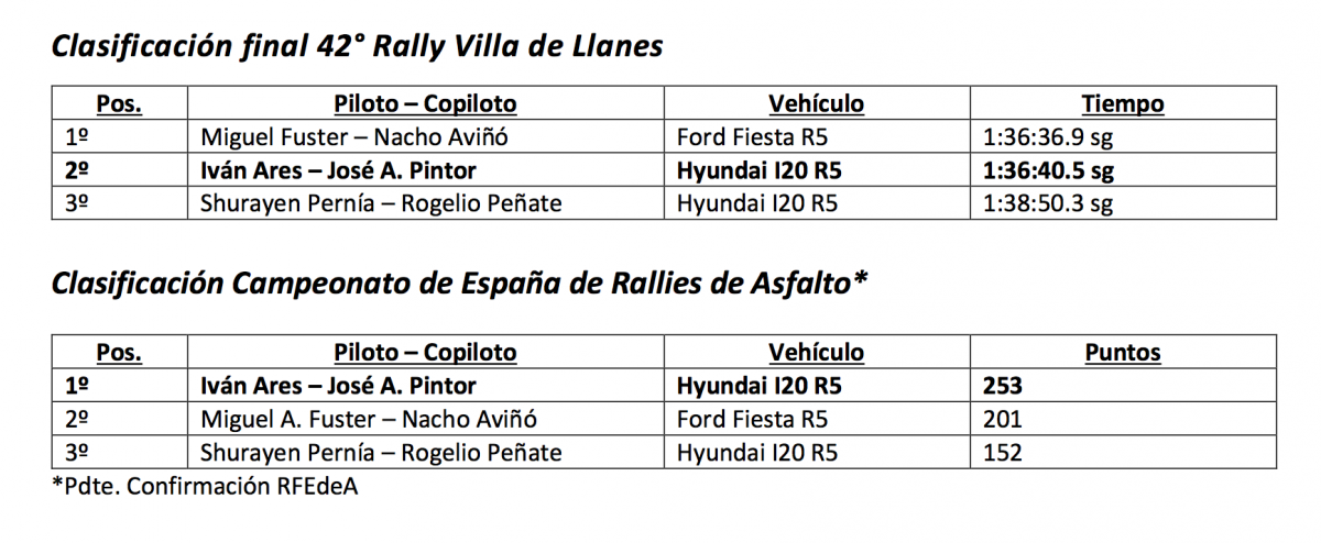Iván Ares comentaba el resultado obtenido en la cita llanisca: “Hemos peleado hasta el final, por la tarde hemos podido atacar y apretar el ritmo, pero no ha sido suficiente para llevarnos el rally. Sabíamos que ganar en Llanes iba a ser complicado, porque nuestros rivales son muy fuertes en esta carrera, pero les hemos plantado cara. Debemos sacar conclusiones positivas de esta carrera y seguir trabajando para intentar llevarnos la victoria a final de temporada.