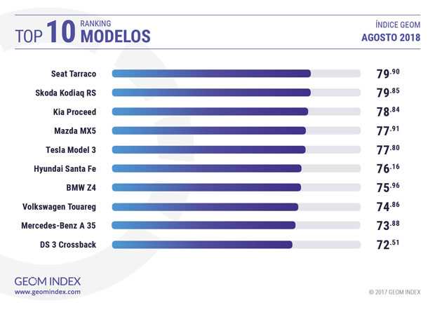 El top 10 lo cerró otra generalista, en este caso Seat, con 72.12 puntos. La firma española se vio impulsada por el rendimiento del nuevo Seat Tarraco, el SUV de 7 plazas que se situó en septiembre como el modelo más valorado por los internautas.
