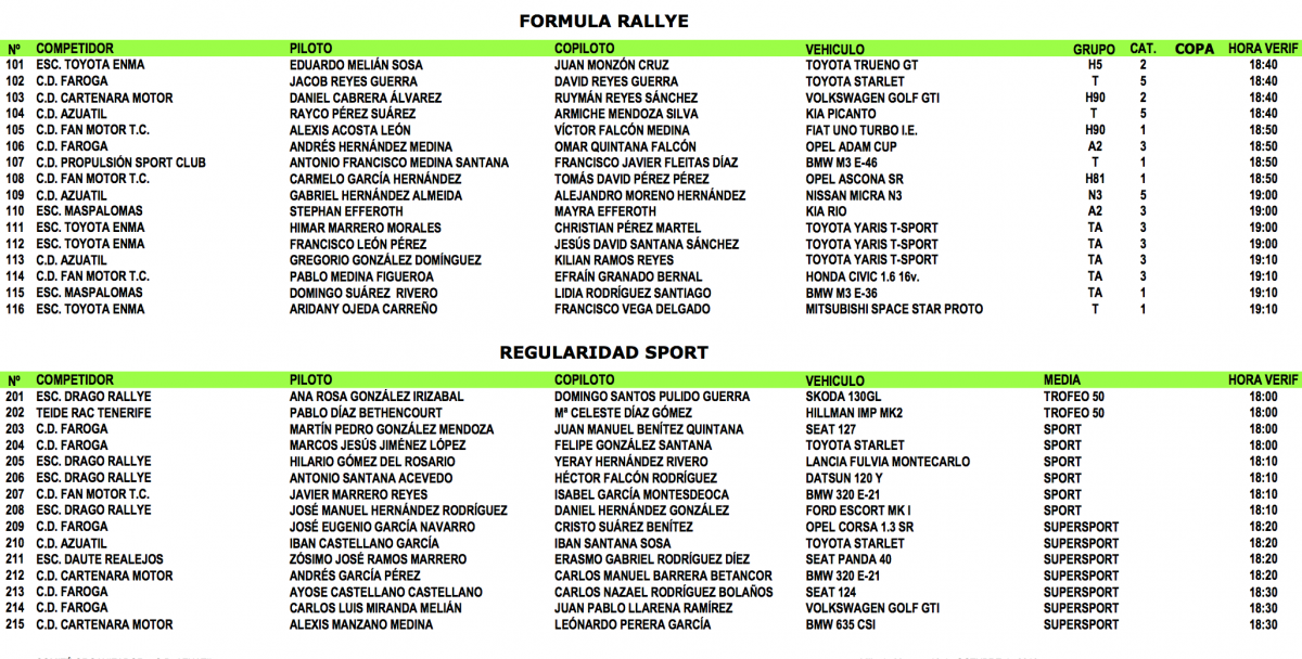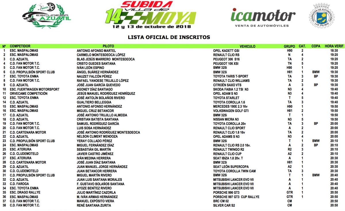 El sábado 13 de octubre, la actividad en Moya comenzará desde muy temprano, con la presentación de pilotos y briefing previo desde las 8:15 horas en el mismo Parque Pico Lomito. Desde aquí saldrán los vehículos para comenzar con la manga de reconocimiento a partir de las 9:30 horas. A continuación se disputarán la primera y segunda manga oficiales, concluyendo con la entrega de trofeos, prevista para las 14:00 horas en el anfiteatro del Parque Pico Lomito.