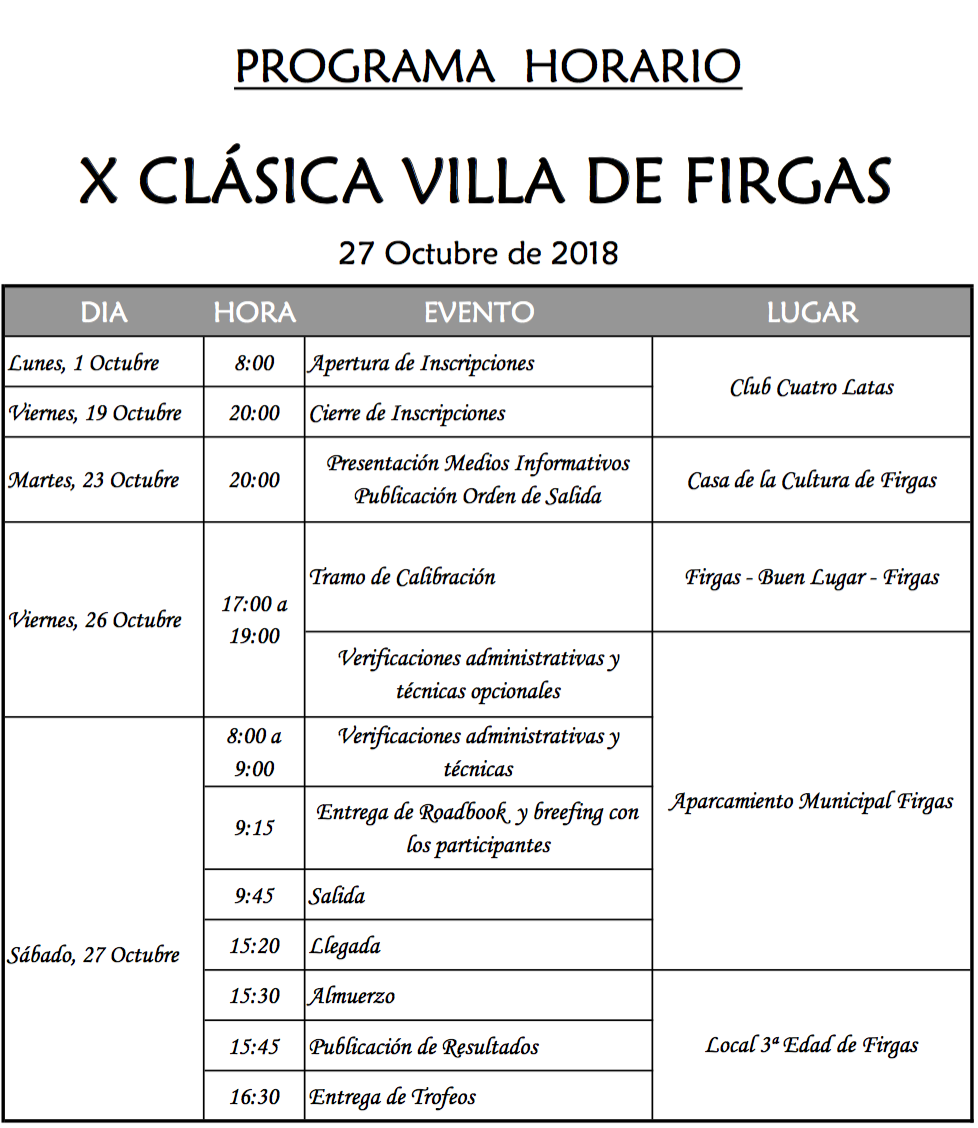 Para esta ocasión la Clásica Villa de Firgas va a desarrollarse en una única jornada durante el sábado 27 de octubre. Tendrá como parque de salida y llegada el aparcamiento municipal de Firgas donde se realizarán las verificaciones administrativas y técnicas el mismo sábado de 8 a 9 de la mañana, no obstante el viernes 26 de 5 a 7 de la tarde también se da la posibilidad de hacerlas aprovechando que el tramo de calibración de esta prueba tendrá salida y llegada en dicho aparcamiento municipal.