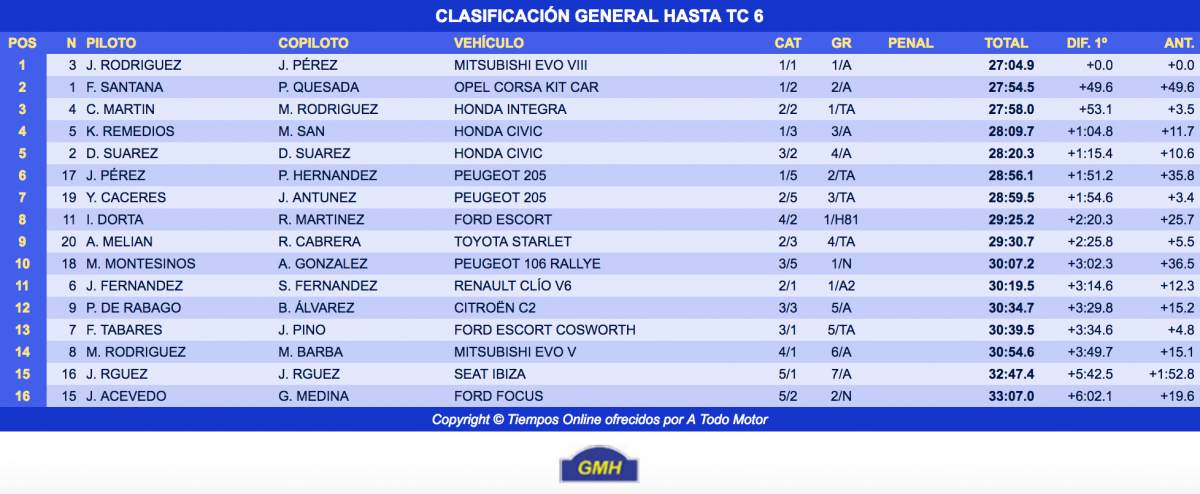 Terceros fueron Carlos Alexis Martín y María Itahisa Rodríguez (Honda Civic Integra), que se quedaban a 53.1 de la cabeza y a solo 3.5 del segundo lugar.