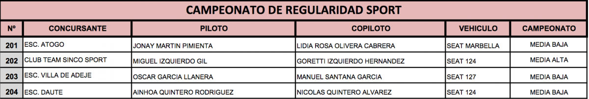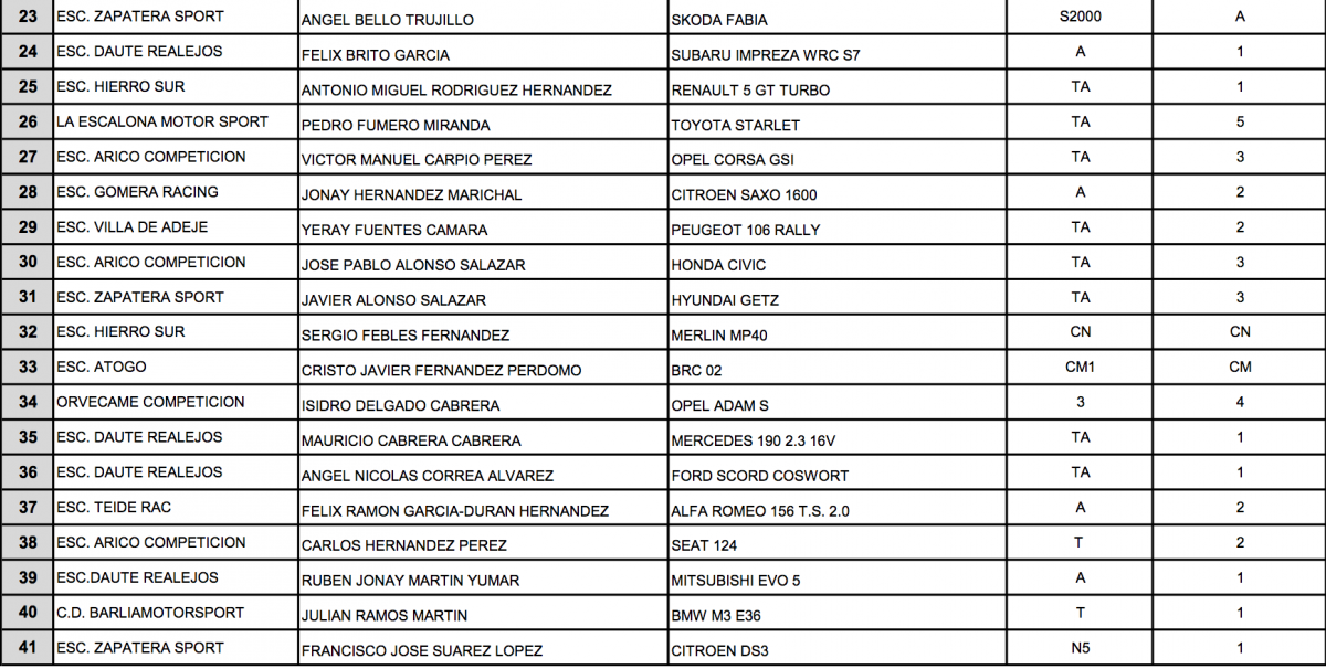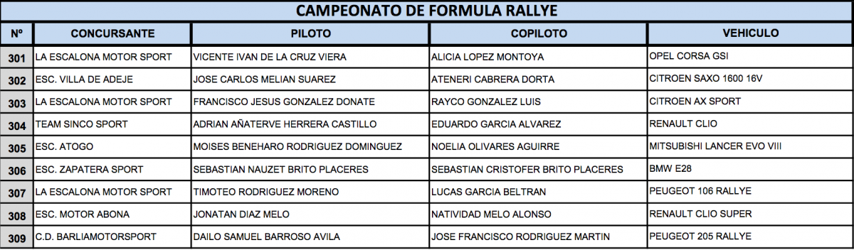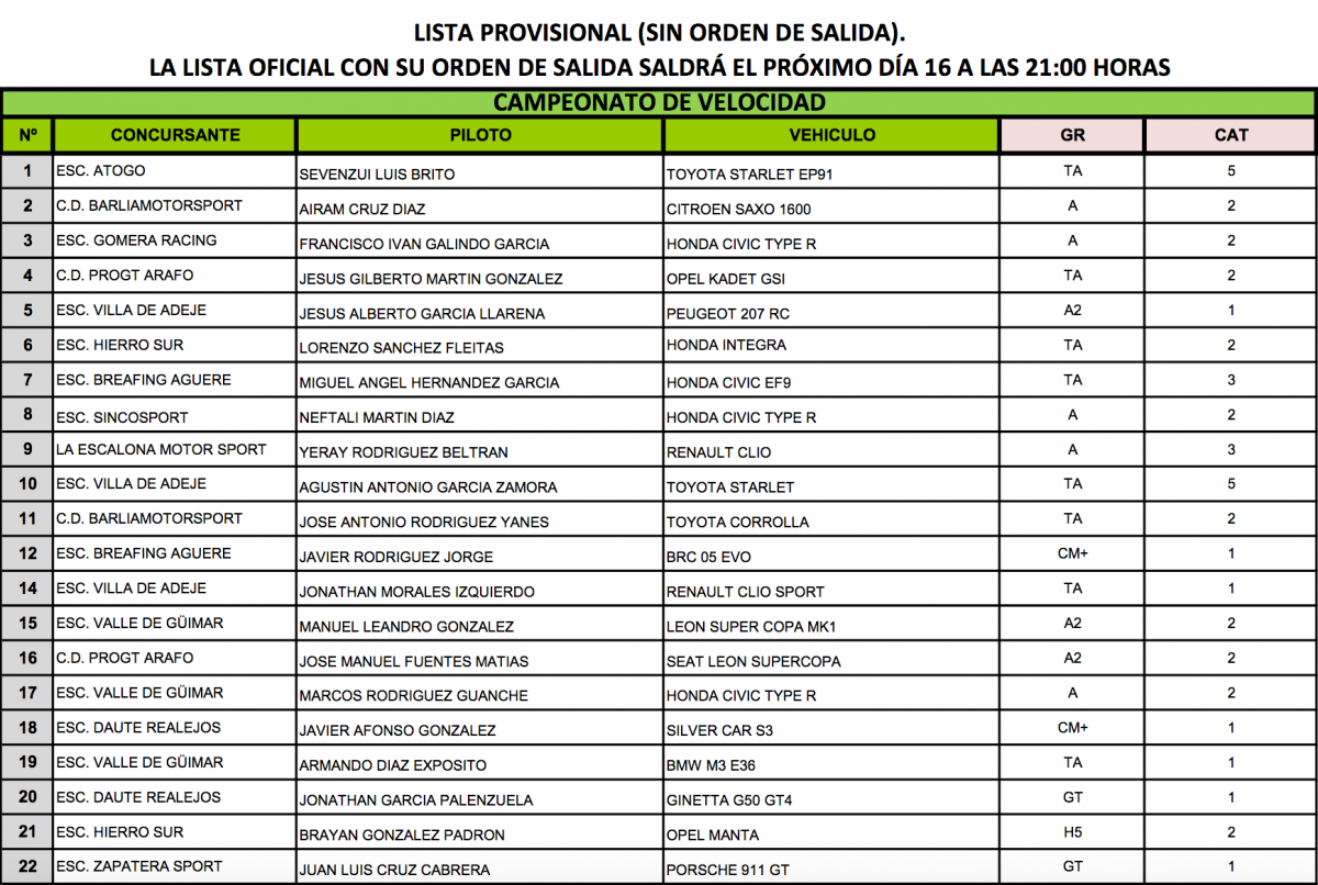 Según la Escudería Zapatera, organizadora de la rampa tinerfeña, la lista de inscritos provisional (sin orden de salida) está compuesta por 40 equipos en la modalidad de velocidad, 9 en formula rally y 4 en RS.
