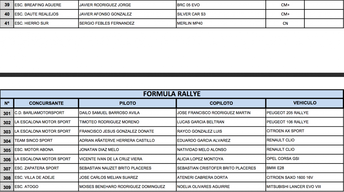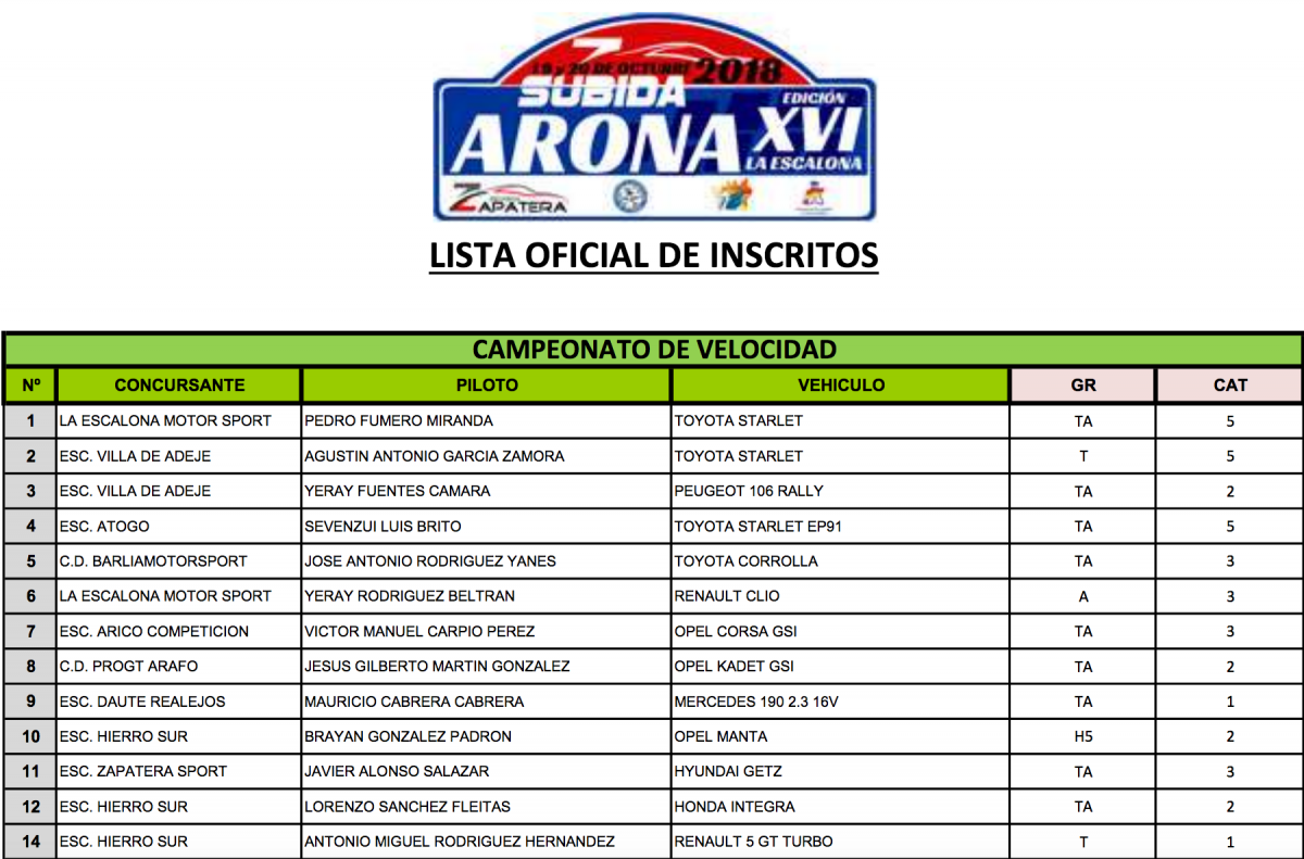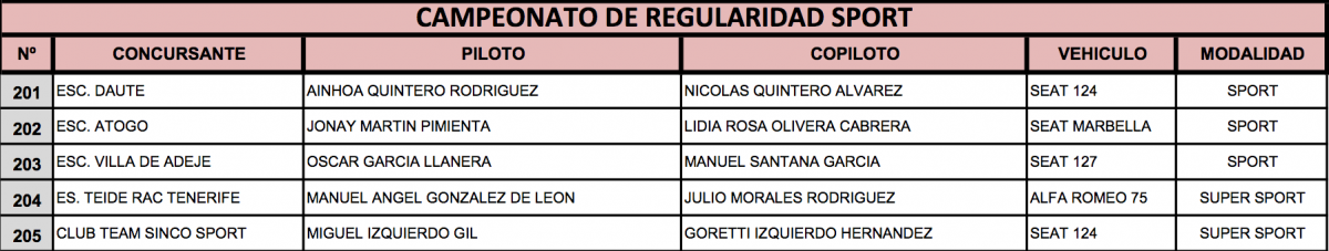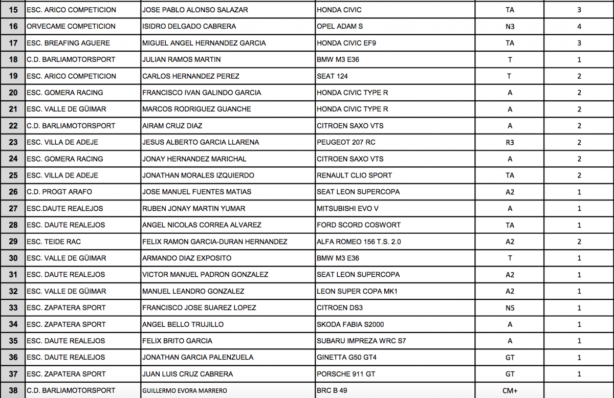 Publicamos la lista oficial de inscritos, con el correspondiente orden de salida de las tres modalidades que tomarán la salida en la rampa tinerfeña este próximo sábado 20. Hay que recordar que el día 17 se publicarán los horarios de la entrega de documentación y verificaciones técnicas, así como el día 19 las Medias de RS.