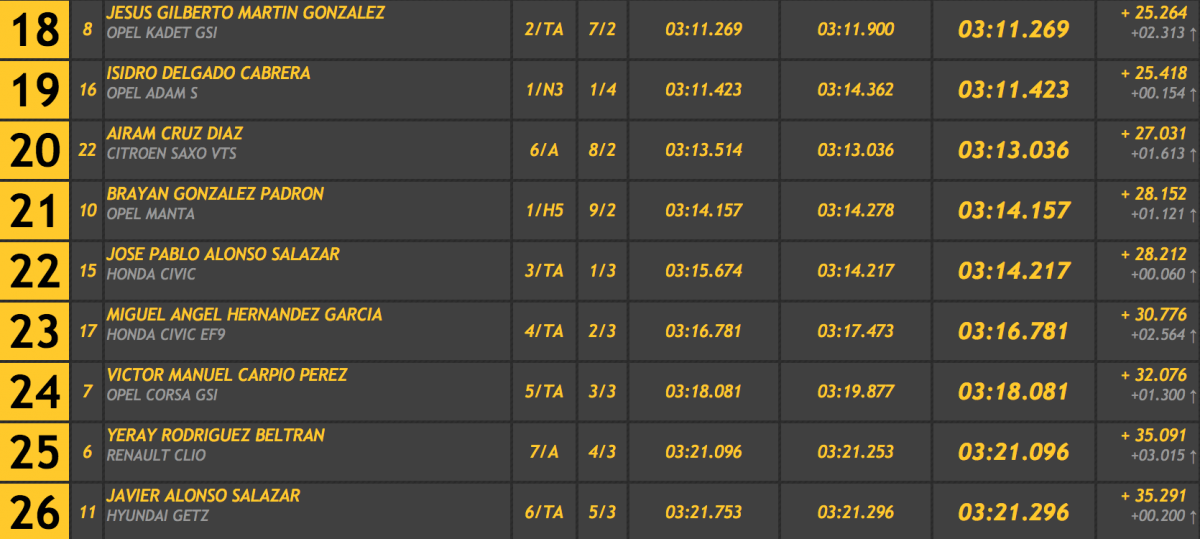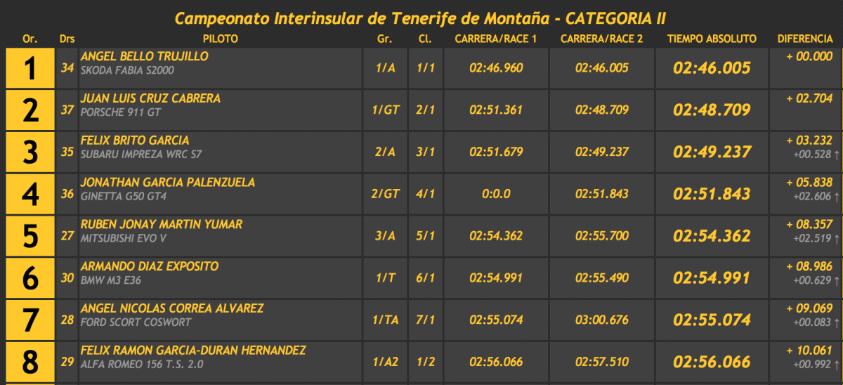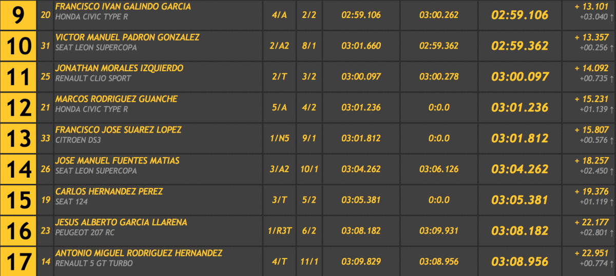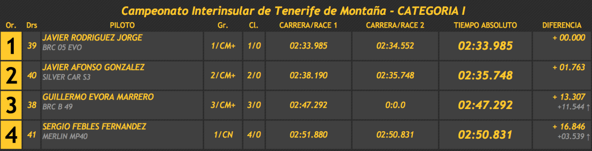 Rodríguez se llevó el triunfo gracias a su primer crono, aunque con el de la segunda ascensión también le habría valido para superar a Javier Afonso (Silver Car S3) en 1.763, siendo tercero Guillermo Évora (BRC B 49), a 13.307.