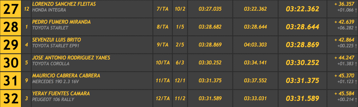 Entre los carrozados casi nadie contaba con que Bello pudiera ser primero visto el potencial de otras monturas, por lo que es una grata sorpresa ver al del Fabia S2000 en lo más alto del podio. Logró superar a Juan Luis Cruz (Porsche 911 GT3) en 2.704, siendo tercero Félix Brito (Subaru Impreza WRC) a 3.232.