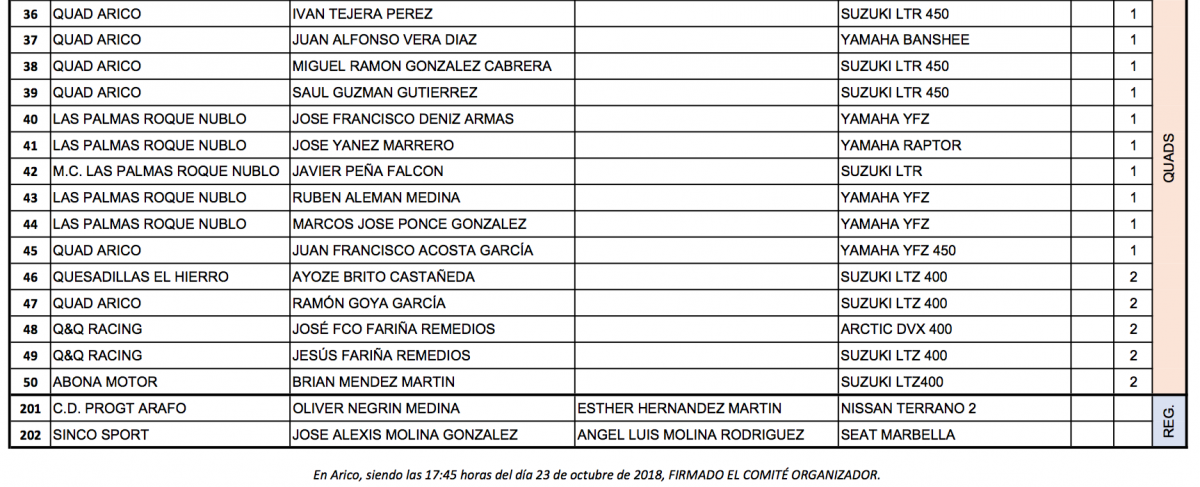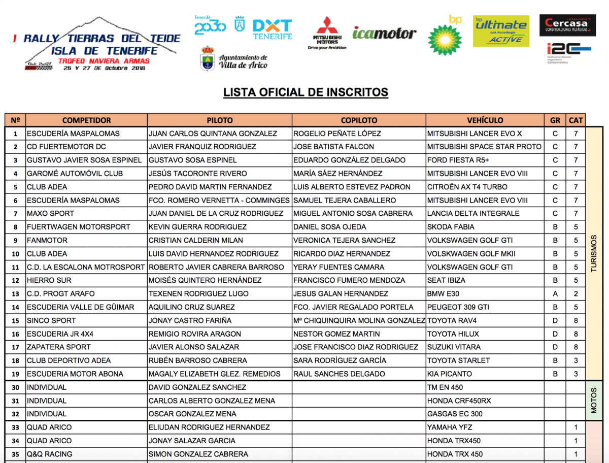 Lista de Inscritos del Rally Tierras del Teide – Isla de Tenerife Por Rafa León Última actualización: 24/10/2018 00:04 Compartir FacebookTwitterWhatsAppEmailTelegramLinkedin Publicamos la lista de Inscritos del Rally Tierras del Teide – Isla de Tenerife · Trofeo Naviera Armas, cita del Campeonato de Canarias de Rallys de Tierra 2018. CanariasRally Tierras del Teide – Isla de TenerifeTenerife Compartir