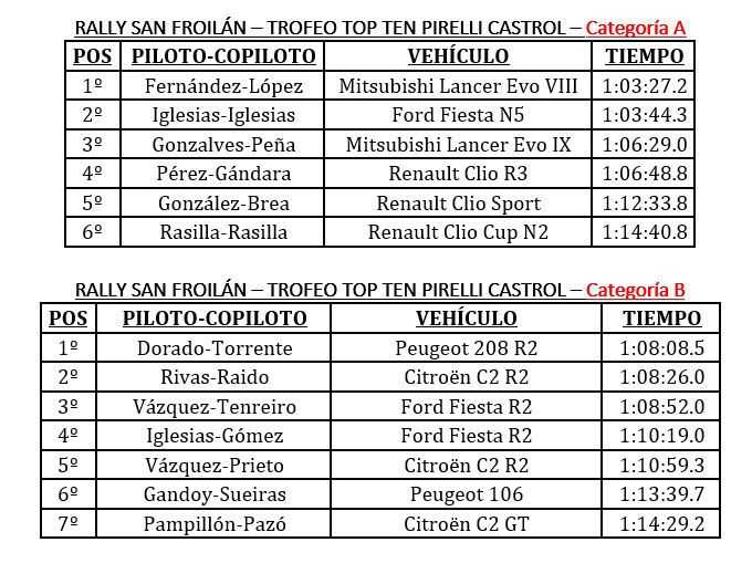 Este fin de semana ha tenido lugar la penúltima prueba del Campeonato Gallego de Rallies, el 40º Rally San Froilán, organizado por la Escudería Miño Lugo y que ha sido puntuable además para la Copa Top Ten Pirelli Castrol, donde la lucha por el título en las diferentes categorías se anima a medida que alcanzamos el final de año.