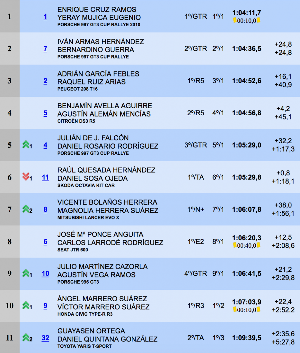 El segundo puesto lo conseguía Iván Armas-Tino Guerra con otro Porsche 911 GT·. El ganador del año pasado en Maspalomas empezó el sábado tomando de forma momentánea el liderato del rallye e intentó ponérselo difícil al piloto tinerfeño, pero no pudo frenar del todo su empuje y debía conformarse con una segunda plaza que le deja muy buen sabor de boca, adjudicándose el scratch en el difícil tramo La Aldea-Mogán. El otro scratch que no fue para Cruz lo obtenía Vicente Bolaños-Magnolia Herrera con el Mitsubishi Evo 10, que fue lo mejor para ellos en un rallye que empezaron con avería en la transmisión.