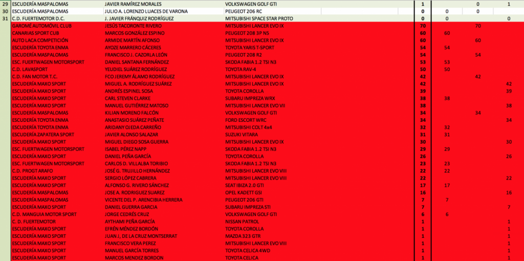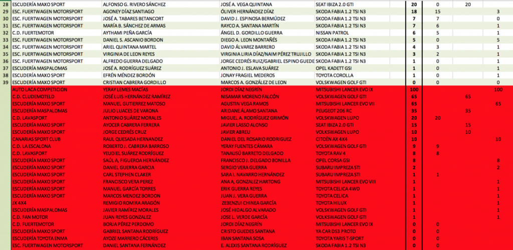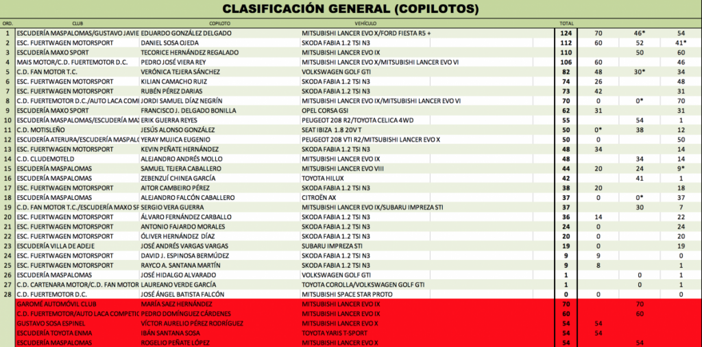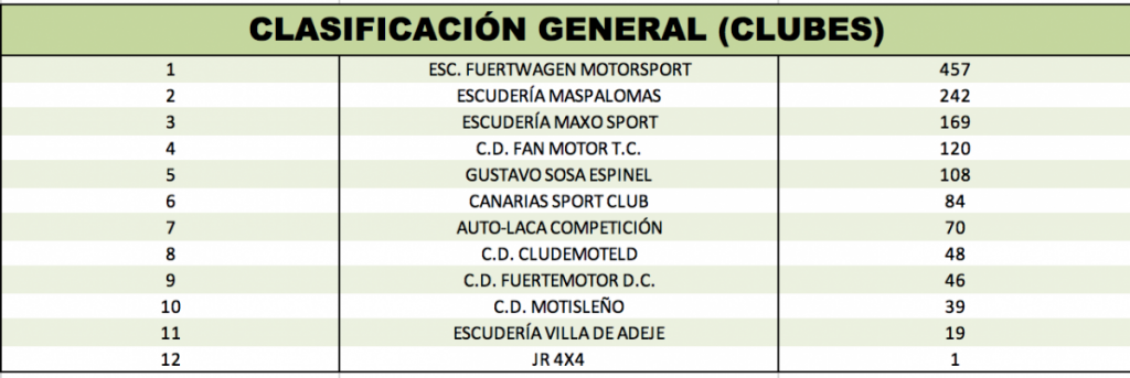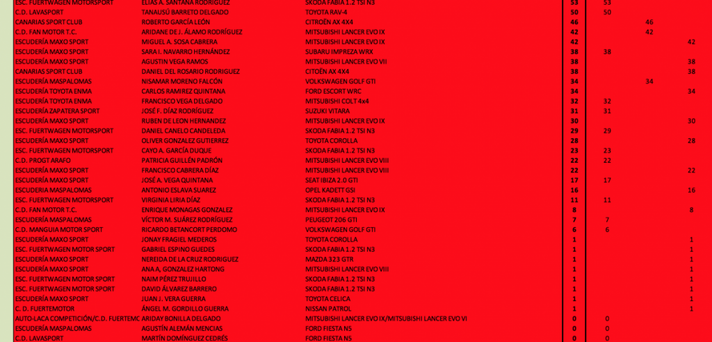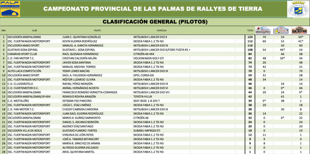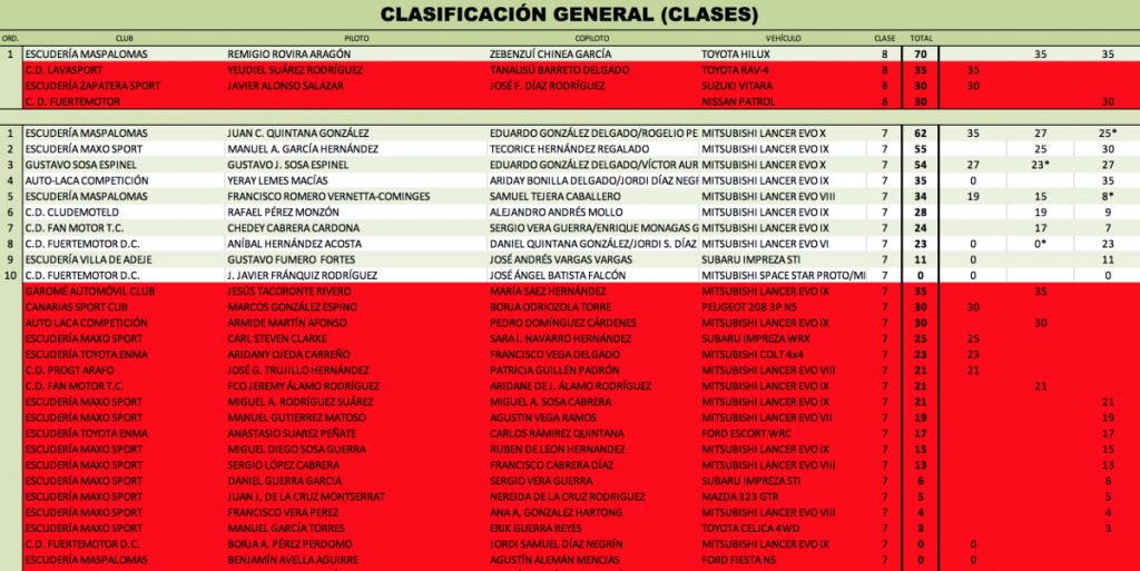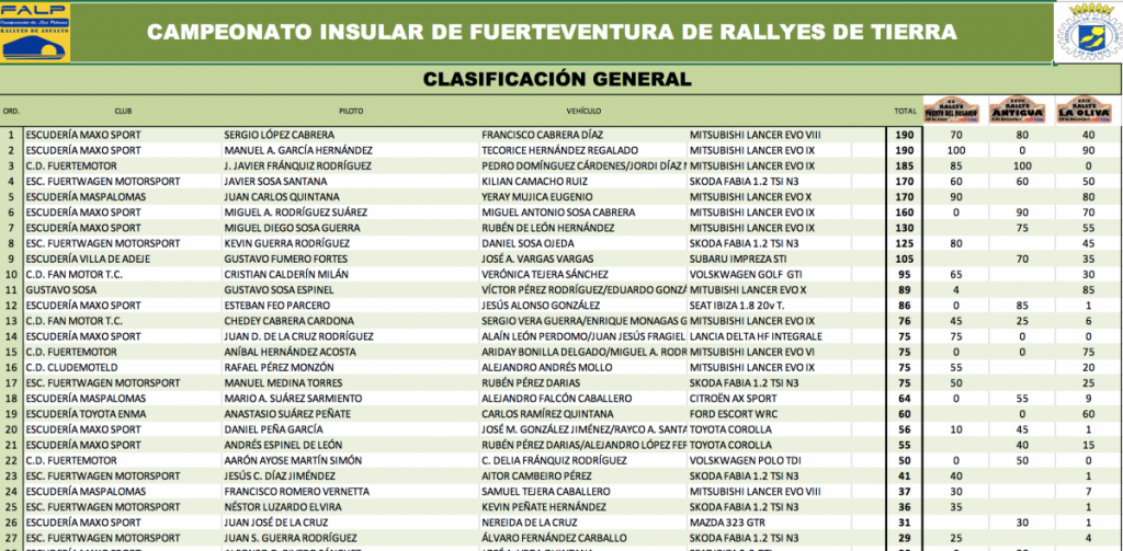 Se adjuntan clasificaciones provisionales tras el Rally de La Oliva, tanto del Campeonato Insular de Fuerteventura como del Campeonato Provincial de Las Palmas.