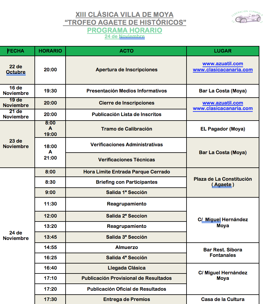 La prueba se disputará el sábado 24 de noviembre. El viernes a partir de las 18.00 horas se realizarán las Verificaciones, y el sábado se dará la salida al primer vehículo a las 09.00 horas, para disputar la primera sección finalizando a las 16.40 horas en la villa de Moya, donde a continuación se realizará la entrega de Trofeos.