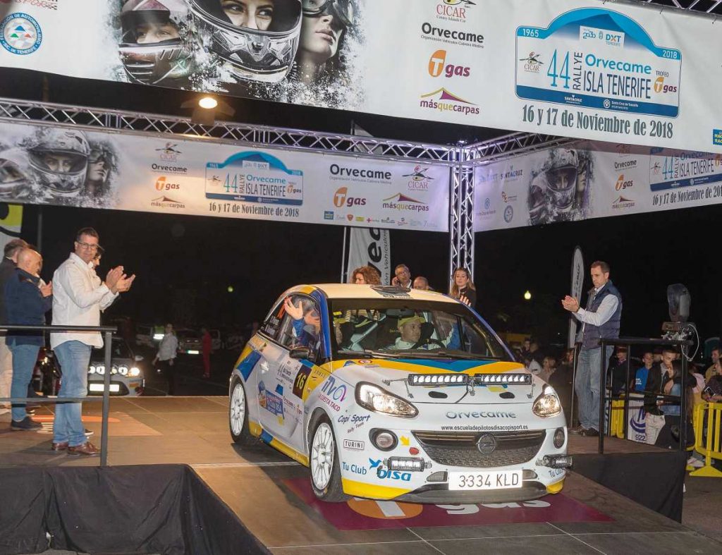 El ganador de la quinta edición de la Escuela de Pilotos Tu Club DISA Copi Sport, Yeray Pérez, junto a su copiloto Mario Quintero, estaba presente en el rallye tinerfeño a los mandos del Opel Adam, con muchas ganas de afrontar un complicado rutómetro con 10 tramos cronometrados variados y selectivos, pero que si se daban las malas condiciones esperadas, favorecía mucho la maniobrabilidad y características técnicas del efectivo vehículo de la categoría R2.