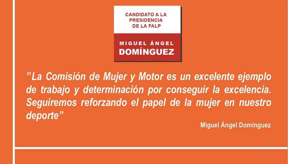 - La Comisión de Mujer y Motor. Esta comisión es un excelente ejemplo de trabajo y determinación por conseguir la excelencia. La mujer está adquiriendo en nuestro deporte el peso específico que le corresponde. Aún queda mucho trabajo por delante, pero creo que todos nos sentimos plenamente orgullosos de ser una de las federaciones en la cual la mujer tiene un gran protagonismo.