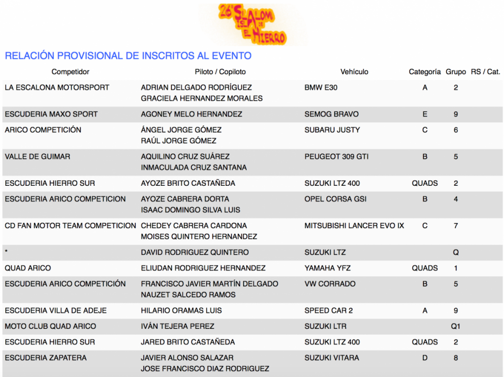 La relación provisional de inscritos (publicada en la web oficial) deja entrever un gran día de carreras en la isla del meridiano cero, pues al atractivo de retomar la competición en el circuito más occidental y meridional de Europa, se une también una calidad de inscripción notable. Serán nada menos que 34 equipos, divididos en 15 turismos, 6 kart cross y 13 quads.