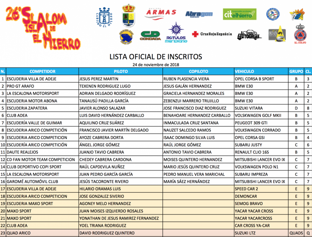 Publicamos la lista Oficial de Inscritos del 24º Slalom Isla de El Hierro. Toda la información de la cita herreña está disponible en la web de la escudería: www.escuderiahierrosur.es