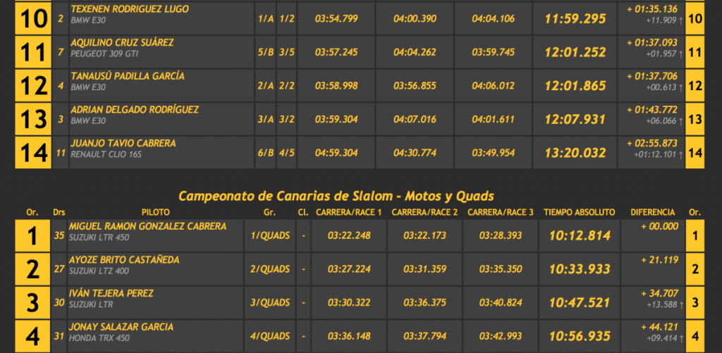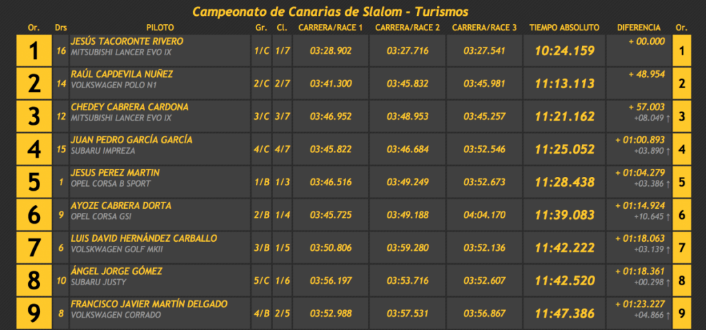 Tacoronte y Saéz ganaron de manera amplia cada una de las tres mangas oficiales disputadas, superando a los segundos clasificados, los tinerfeños Raúl Capdevila y Mario Quintero (Volkswagen Polo N1), en 12, 18 y 18 segundos en cada una de las cronometradas para conseguir una diferencial final de 48.954.