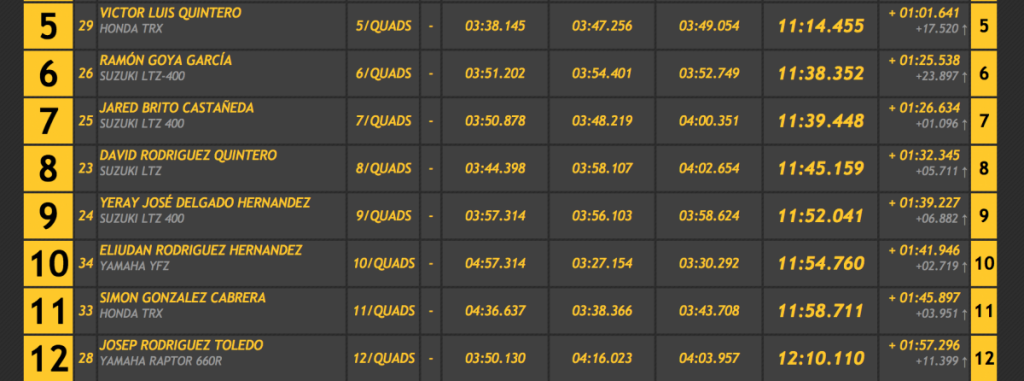 Terceros finalizaron Chedey Cabrera y Moisés Quintero (Mitsubishi Lancer Evo IX), a 08.049 de los anteriores y superando a Juan Pedro García y Pedro Manuel Vera (Subaru Impreza STI), cuartos, en 3.890.