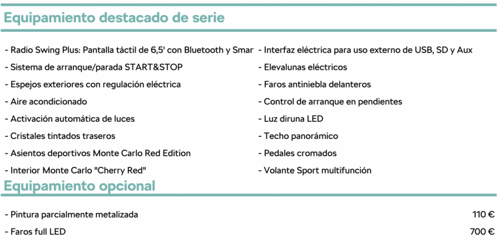 La unidad trae un completo equipamiento de serie, como los faros antiniebla, elevalunas eléctricos delanteros, cierre centralizado con mando, retrovisores térmicos, ordenador de viaje, sistema de sonido Swing, puerto USB, alfombrillas específicas, paquete cromado interior, aire acondicionado, llantas de 16 pulgadas, asiento posterior partido, control y limitador de velocidad, techo panorámico de cristal fijo que aumenta la luminosidad del interior (incluye cortinilla retráctil), etc, además de algunos extras como la cámara de visión trasera.