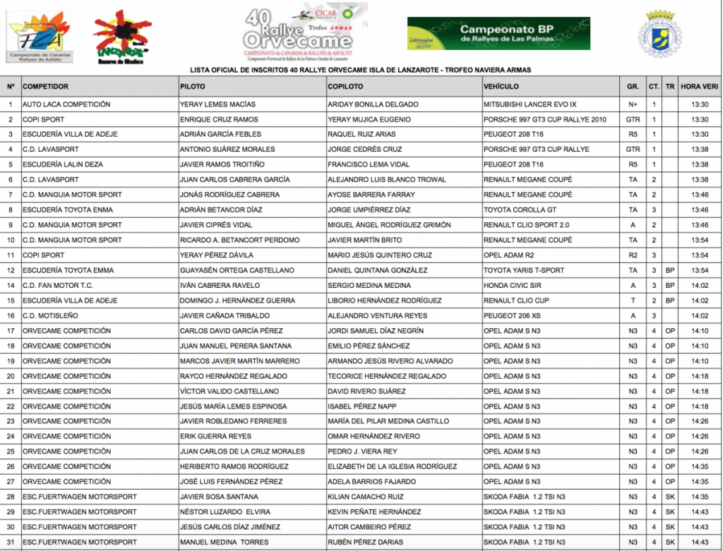 Con el número 1 sale el equipo de Yeray Lemes-Ariday Bonilla con Mitsubishi Lancer Evo, ganador de la prueba de su isla el pasado año y en siete ediciones más, en esta ocasión son su montura particular que lo va a tener más difícil para disputar el triunfo a los importantes equipos que visitan la isla de Lanzarote este fin de semana.