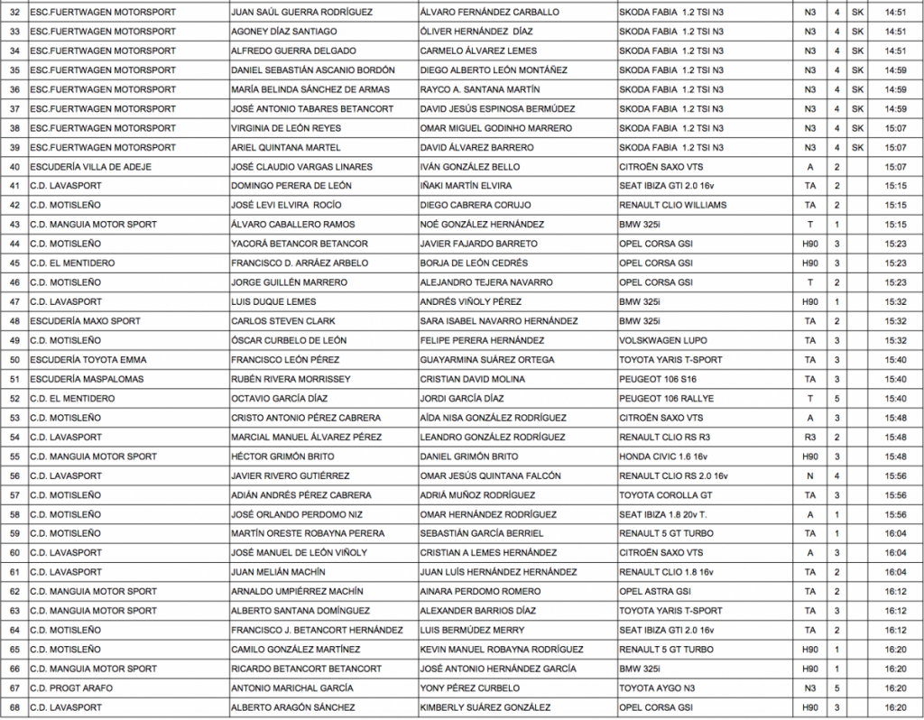 Y por los 12 equipos de la Copa Skoda Fabia de Lanzarote y Fuerteventura, que llega con Javier Sosa-Kilian Camacho como claros líderes, pero con las plazas de podio todavía en el aire y que se van a decidir en parte en este rallye, ya que a esta monomarca les resta todavía otra competición más.