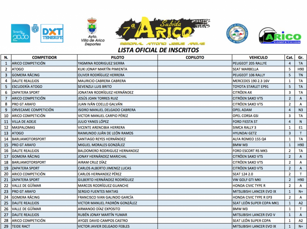 Publicamos la lista oficial de inscritos de la VII Subida Arico 2018, donde destaca la presencia de Lauren García (Porsche 997 GT3) y Víctor Delgado (Mitsubishi Lancer Evo IX) entre los turismos.