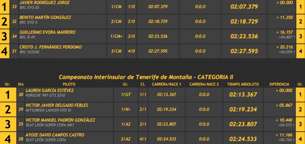 Este crono le ha servido para superar a Víctor Delgado (Mitsubishi Lancer Evo IX) en 5.867. Tercero es Víctor Manuel Padrón (Seat León Supercopa MK1), a 10.440, seguido muy de cerca de Ayoze David Campos, con otro MK1, a solo 0.726.