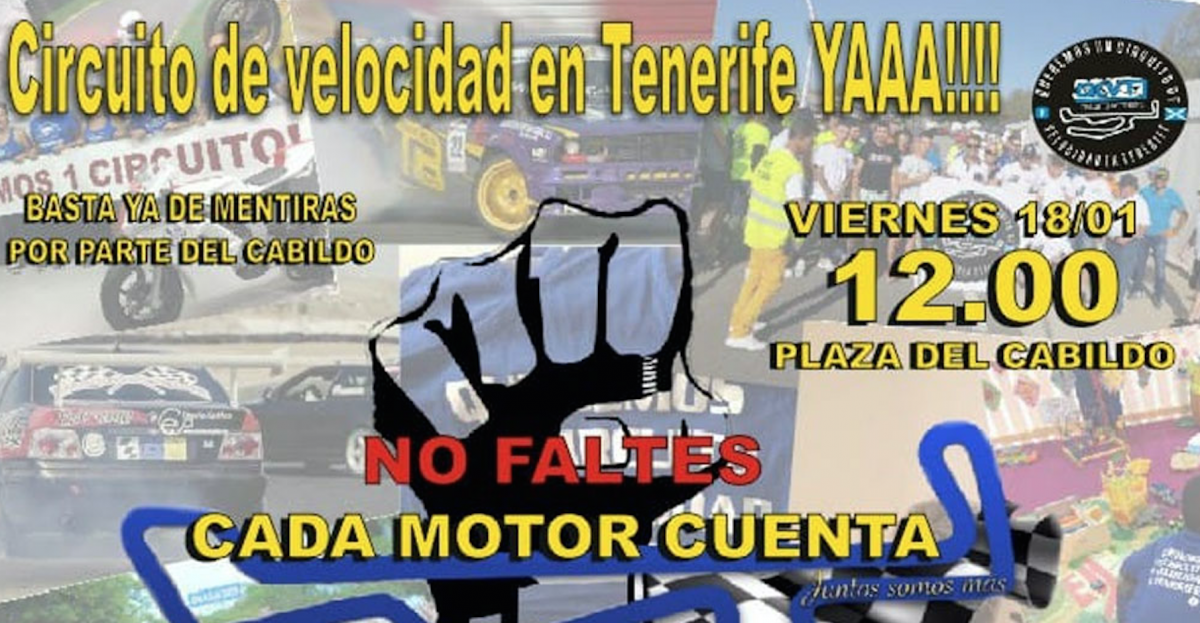 La Plataforma Queremos un circuito de Velocidad en Tenerife, bajo el lema “Cansados de mentiras por parte del Cabildo”, espera reunir a miles de aficionados al mundo del motor el próximo viernes 18 de enero a las 12,00 horas frente a la sede del Cabildo de Tenerife, donde está previsto que se entreguen en el Registro de Entrada del Cabildo las 15.000 firmas recogidas en apoyo de la construcción de un circuito de velocidad para la Isla de Tenerife.