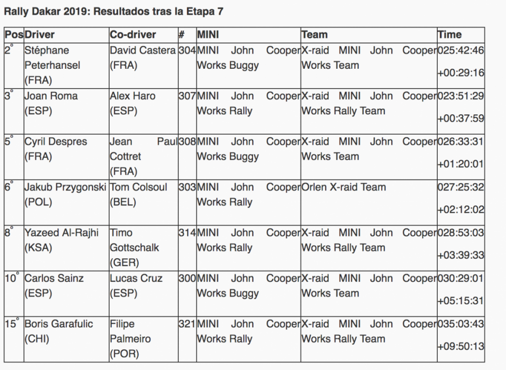 Los pilotos y copilotos de MINI consiguieron un fantástico resultado en la séptima etapa del Dakar 2019. Tres MINI, encabezados por Stéphane Peterhansel y David Castera, lograron colocarse entre los tres primeros puestos de la clasificación después de una ajustada jornada, en la que el primer y tercer clasificado estuvieron separados por solo 9 minutos y 28 segundos.