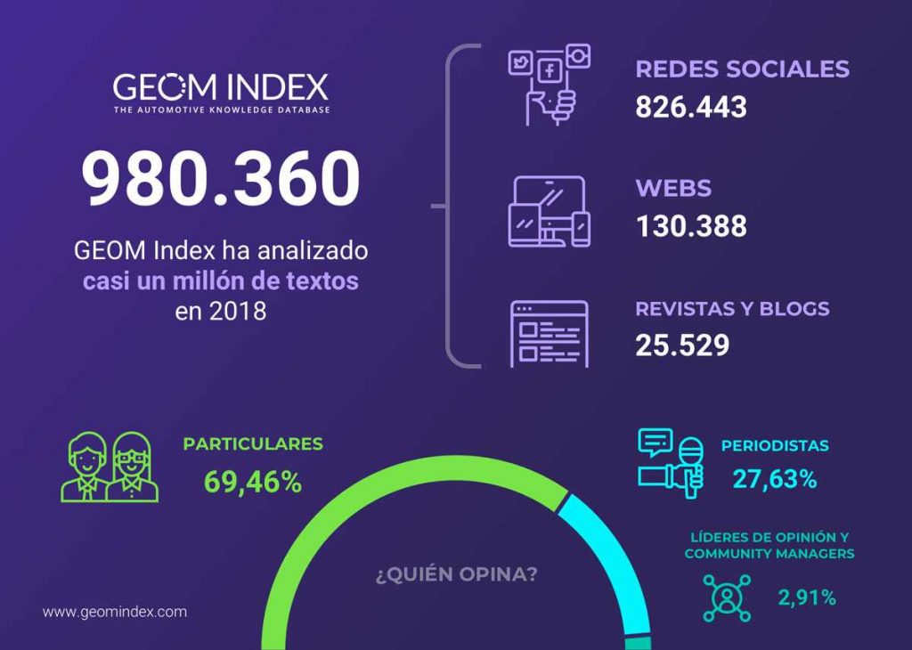GEOM Index ha analizado en 2018 casi un millón de textos (980.360) procedentes de las principales páginas web españolas, blogs y foros dedicadas al mundo del motor, y también de los perfiles que tienen las marcas, los medios de comunicación, los periodistas y las personas influyentes en las redes sociales (Facebook, Twitter, Instagram y Youtube). Tras el procesamiento de los datos, el Peugeot 508 ha logrado en 2018 el mejor coeficiente de opiniones positivas de los internautas españoles, combinado con una gran capacidad para generar comentarios en la red. El GEOM Index base su ranking en la extracción de fuentes de calidad, y prima a aquellos modelos que suscitan más debate y opinión sobre lo que generan más menciones.