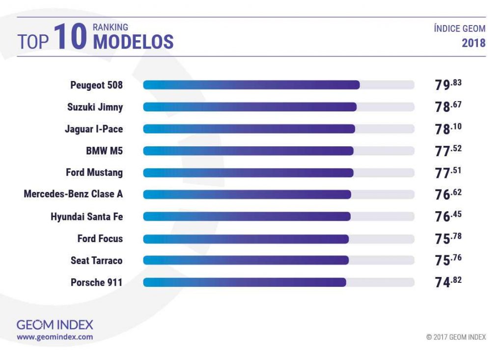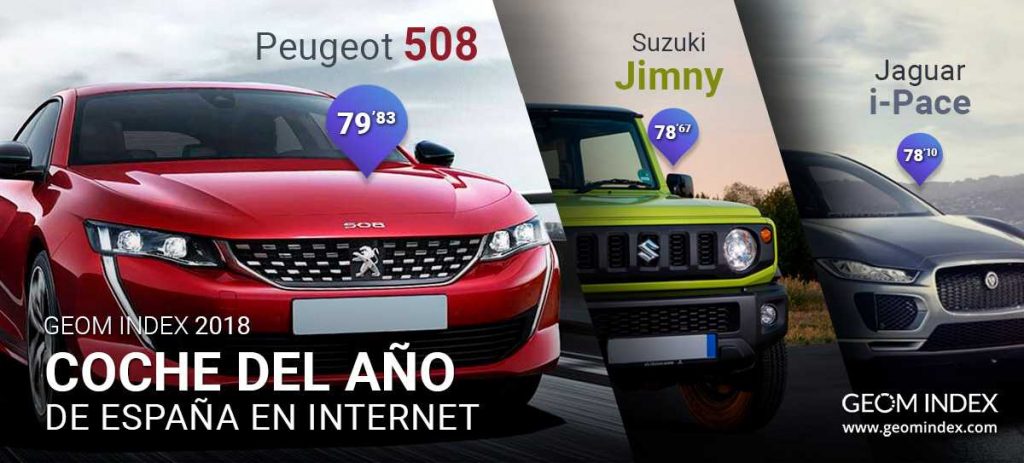 La berlina de origen francés Peugeot 508 se convirtió en 2018 en el modelo más valorado por los internautas españoles según GEOM Index, el índice de referencia para el mercado automovilístico español que tiene en cuenta tanto la opinión de los usuarios en la red como la notoriedad que alcanzan los fabricantes. El nuevo 508 se corona por primera vez como Coche del Año de España en Internet, y sucede en este reconocimiento anual avalado por la consultora española al Porsche Panamera (2017), al Skoda Superb (2016), Mazda MX-5 (2015), Volkswagen Golf (2014) y Audi A3 (2013). Por su parte, el todoterreno Suzuki Jimny ascendió hasta la segunda posición anual del ranking, mientras que el eléctrico Jaguar I-Pace completó el cuadro de honor en 2018.