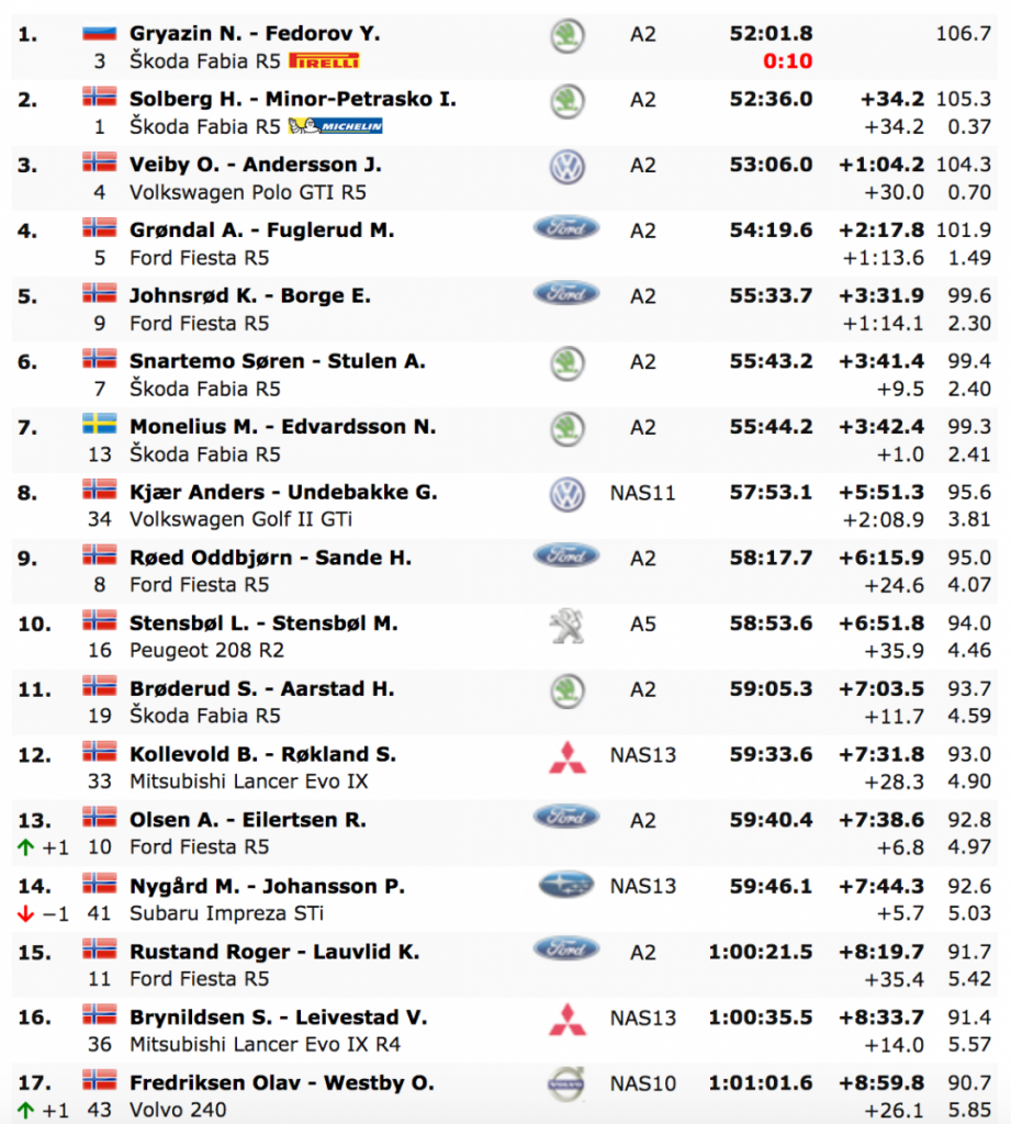 Gryazin comenzó a sacar ventaja tramo tras tramo, solo pudiendo ser seguido por Henning Solber (Ford Fiesta R5), que se quedaba a 34.2 al final del rallys. Cerraba los puestos de podio el también local Ole Christian Veiby (VW Polo R5), a 1:04.2, mientras que cuarto se situó Anders Grondal (Ford Fiesta R5), a 2:17.8.