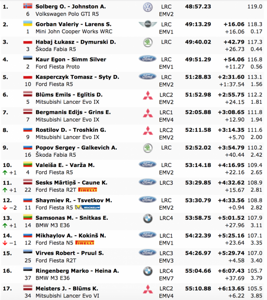 La clasificación general la completaron Valerly Gorban (Mini JCW WRC) a 16.6; Lukasz Habaj (Skoda Fabia R5) a 42.7 y