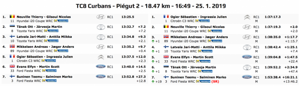 La cancelación de la primera especial supuso un duro golpe para Ogier, cuyos neumáticos de invierno con clavos le habrían permitido sacar provecho de la nieve y el hielo. Neuville aprovechó las dos pruebas siguientes para situarse líder de la noche, Ott Tänak, y al líder, Ogier, después de la primera vuelta.