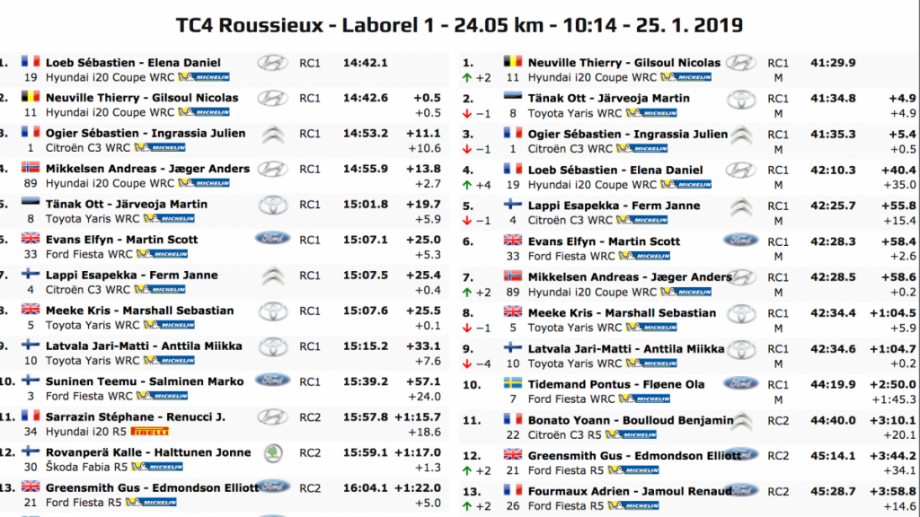 Los galos Loeb y Ogier han sido los más rápidos en uno de los dos tramos celebrados, pero Neuville, que fue segundo en ambas especiales, se situó primero nada más arrancar al dejar al anterior líder, el estonio Tänak, a 4.9. En la segunda crono Ogier, que fue el más rápido, se situó segundo a 3.4 del primer puesto, mientras que Tänak se descolgó de la lucha por el liderato al caer al tercer puesto a 16.9.