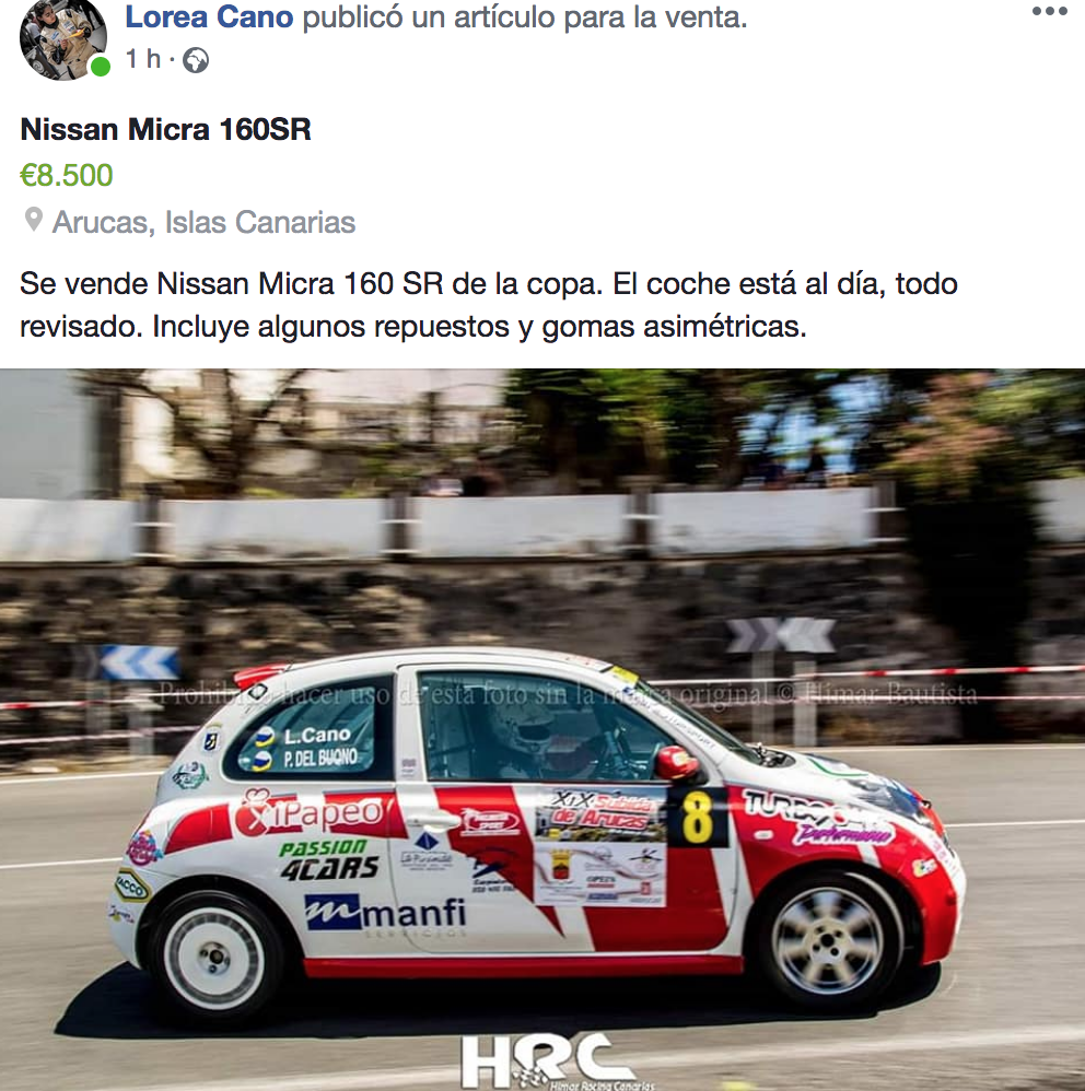 Por eso ha puesto en venta el Nissan Micra con el que ha venido compitiendo las últimas temporadas. “La idea es vender nuestro actual coche para cambiar de proyecto. Queremos correr en la tierra, pero aún no hay nada cerrado con la montura”, detalló a Automovilismocanario.com