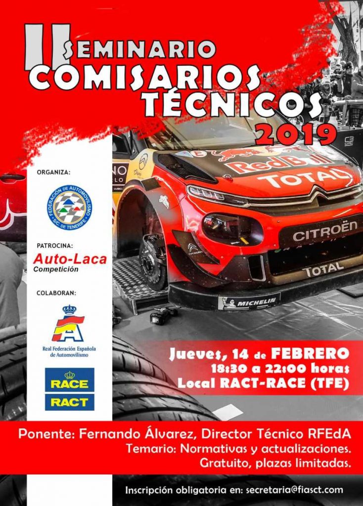 Gracias al patrocinio de Auto-Laca Competición y la colaboración de la RFEdA y RACT-RACE, el próximo día 14 de febrero (jueves) se celebrará una nueva edición del Seminario de Comisarios Técnicos. La primera edición se celebró en 2017 bajo la organización de la escudería Aguere Motor (que entonces presidía el actual presidente de la federación tinerfeña Francisco Negrín), tomando ahora el testigo la FIASCT y su nueva junta de gobierno.